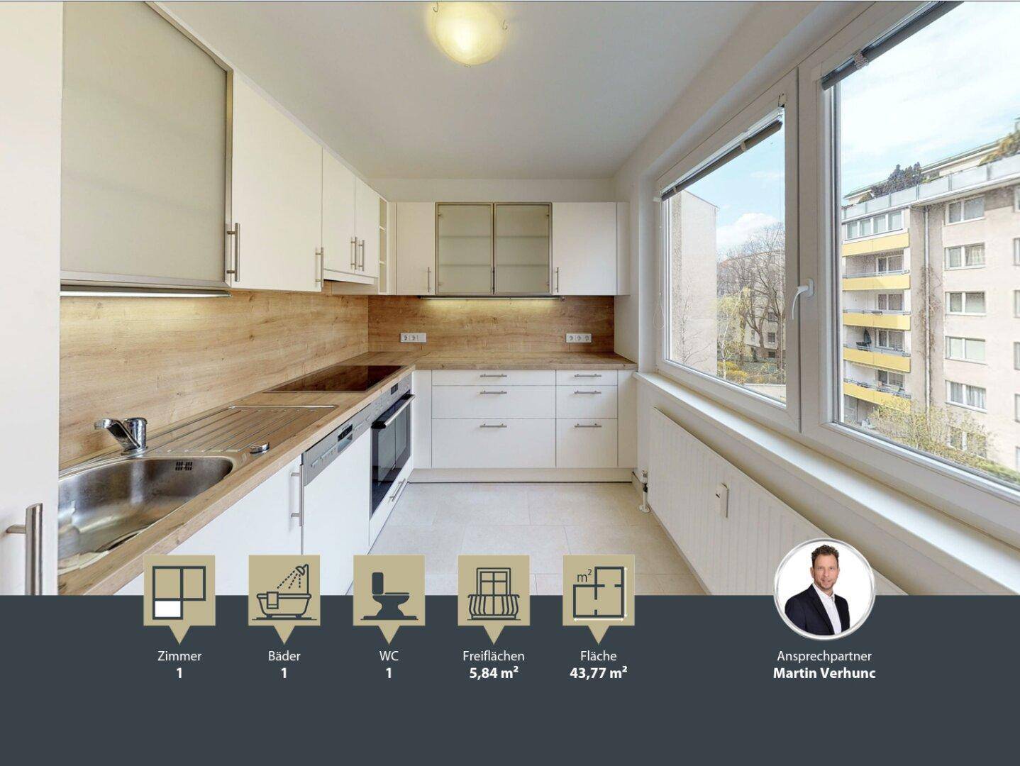 Zur Vermietung gelangt ein tolles 1 Zimmer Apartment mit einer Gesamtnutzfläche von ca. 43,77 m² inkl. einer Loggia mit 5,84 m². Das Apartment teilt sich wie folgt auf: Wohn/Schlafbereich mit ca. 22,68 m², einer Küche mit 6,23 m², einem Badezimmer 3,48 m² mit Dusche. Die Wohnung ist möbliert (Möbel sind nicht ganz ein Jahr alt) und in der Miete enthalten. Die Wohnung verfügt über eine Gegensprechanlage. Ein Lift bringt sie bequem in den 3. Stock.