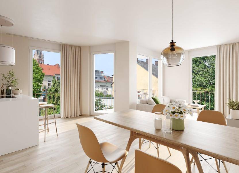 Als absolute Rarität am Grazer Wohnungsmarkt entsteht mitten im Herz-Jesu-Viertel in einer Innenhoflage ein exklusives Wohnprojekt mit 49 hochwertigen Neubau-Wohnungen (aufgeteilt auf zwei Häuser), die größtenteils über Freiflächen verfügen! Das Projekt verfügt außerdem über eine hauseigene Tiefgarage (inkl. Fahrradabstellplätzen), in dieser Gegend ebenso eine Besonderheit. Genießen Sie hier den hochwertigen Wohnkomfort, die einzigartige Lage und die sonnigen Freiflächen. In unmittelbarer Nähe der Wohnanlage befinden sich Supermärkte, Bauernmärkte, Restaurants, Ärzte, Apotheke, Unis, Schulen, Kindergärten, Parkanlagen,... - alles vor Ihrer Haustüre! Wohlfühl Grätzel-Feeling ist hier garantiert! Bus und Straßenbahn sind ebenso leicht erreichbar und mit dem Auto sind Sie in nur wenigen Minuten auf der Autobahn. Zu Fuß ist es nur ein kurzer Spaziergang in die Grazer Innenstadt - zentraler und charmanter kann man in Graz nicht wohnen!