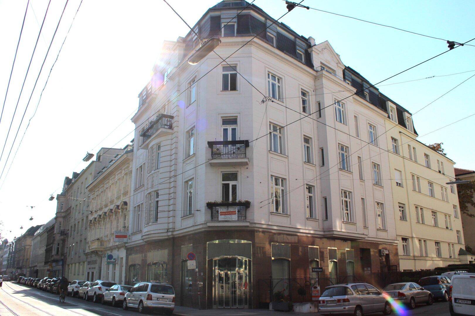 Großzügige Fensterflächen, die sowohl die Döblinger Hauptstraße als auch die Reithlegasse beobachten, machen dieses Eckgebäude aus.