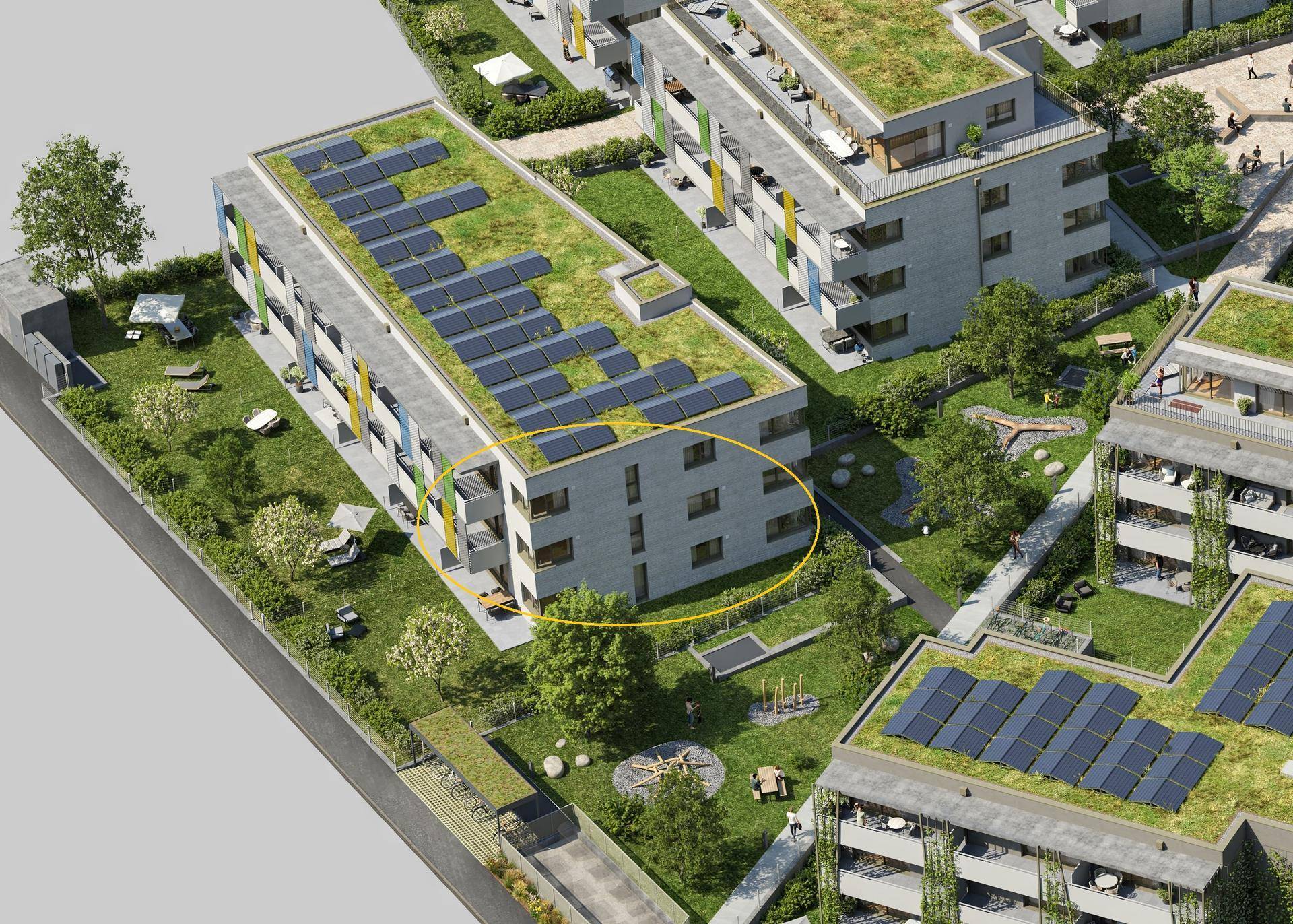 Mehrere Kinderspielplätze und Freibereichszonen sind im Baukonzept berücksichtigt und sorgen für eine gute Aufenthaltsqualität. Die 1-5-Zimmer-Wohneinheiten verfügen außerdem über vielfältige Freibereiche in Form von Gärten, Balkonen und Terrassen.