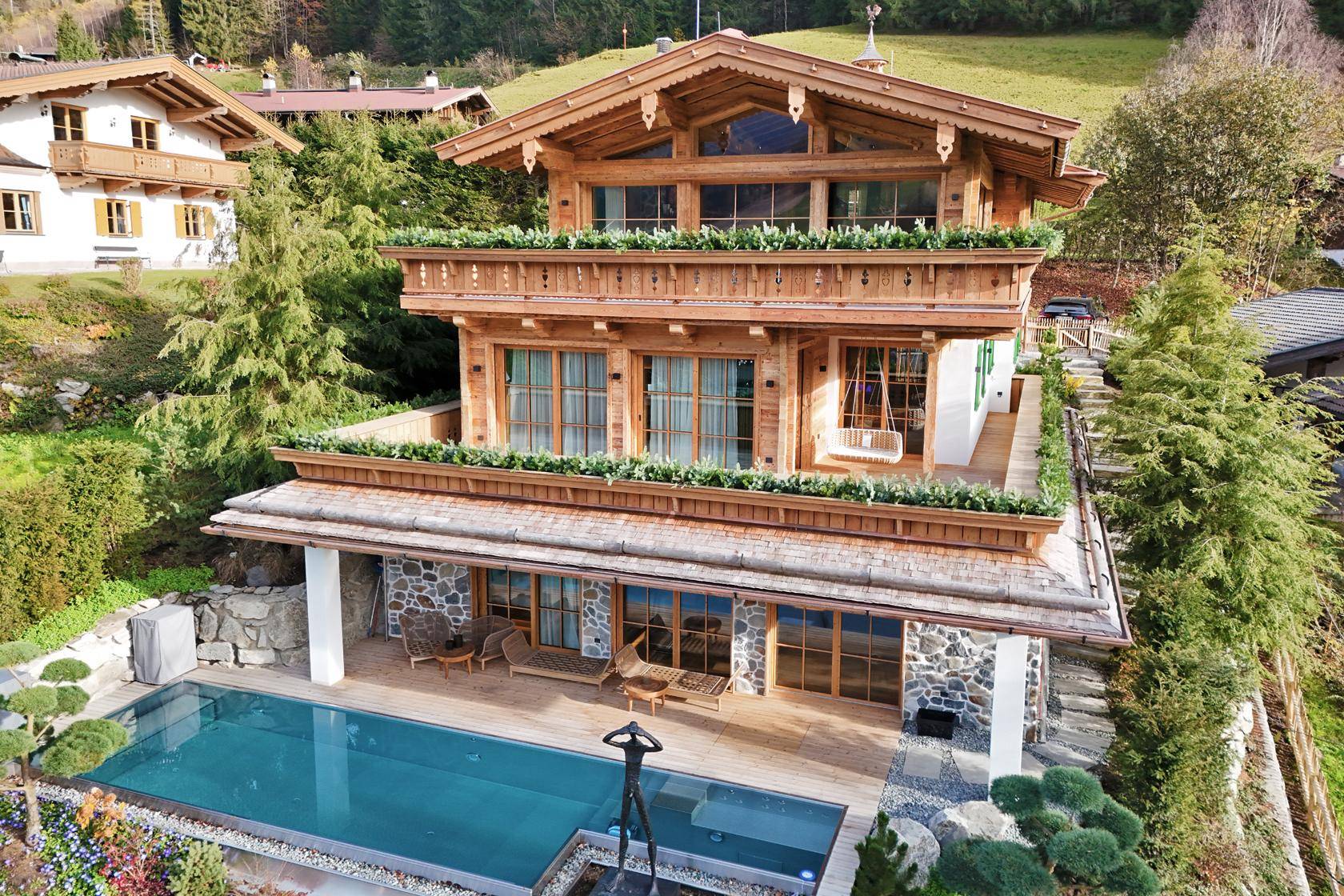 Das rund 600 m² große Chalet inkl. Terrassen und Balkonen verfügt über fünf Schlafzimmer, vier Bädern und zwei separate WC's sowie einen großzügigen Wohn- / Essbereich mit Festbrennstoff-Kamin und offener Designer-Küche mit traditioneller Bauernstube mit einem Kachelofen für die gemütlichen Stunden im Winter wie im Sommer. Die bodentiefen Fensterflächen im obersten Stockwerk öffnen den Blick und sorgen für einen lichtdurchfluteten Wohnraum mit einem Altholzsichtdachstuhl und traumhaften Raumhöhen. Von dort aus hat man Zugang auf eine großzügige Panorama-Terrasse. Ein Galeriebereich bietet zusätzlichen Wohnraum für den entsprechenden Komfort zum Entspannen, Fernsehen oder um einfach die Seele baumeln zu lassen. Auf der ebenerdigen Etage befindet sich der Masterbereich, der über eine separate Ankleide und ein stylisch eingerichtetes Bad mit freistehender Wanne, Dusche sowie ein Heimkino verfügt. Ein einladender Landing-Bereich bereitet einen angenehmen Empfang und zwei weitere Schlafzimmer mit jeweils einem Bad en suite runden diese Etage ab. Auf der unteren Ebene wird neben zwei weiteren Schlafzimmern für vielfältige Abwechslung gesorgt. Genießen Sie einen Film im hauseigenen Heimkino für die ganze Familie oder ein gutes Gläschen Wein mit Ihren Gästen im Weinkeller. Der angrenzende Spa-Bereich wird ausgestattet mit einer Sauna, einem Tauchbecken, Gym und einer Ruhezone. Auf der vorgelagerten Terrasse stehen Ihnen darüber hinaus ein ganzjährig beheizbarer Außenpool sowie einen Hot-Whirlpool zur Verfügung.