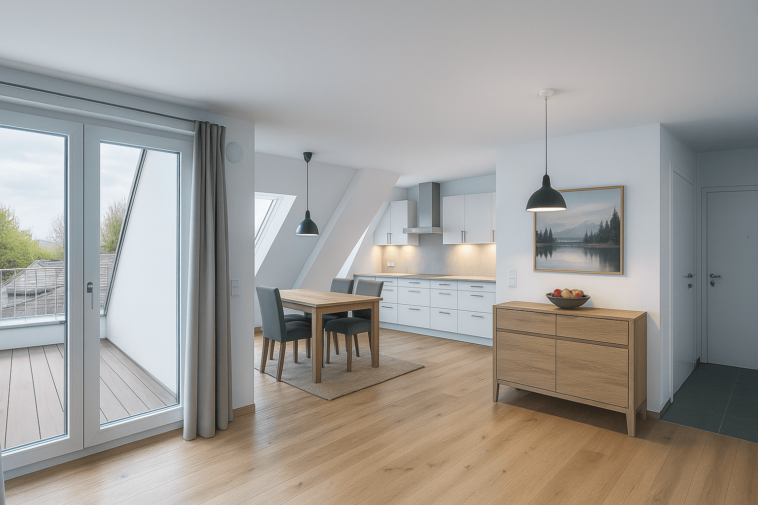 Top 16 - 3 ZimmerWohnfläche 85,01 m²Wohnküche 37,53 m²1. Schlafzimmer 19,27 m²2. Schlafzimmer 20,02 m²Badezimmer 3,67 m²separates WC 1,85 m²Terrasse 10,91 m²Besonderheiten- Große Wohnküche mit Balkonzugang- Süd-östliche Ausrichtung für sonnige Momente- Großes Badezimmer und separates WC- Familienwohnung mit zwei Schlafzimmern- Dachgeschosseigentum für zusätzliche Privatsphäre