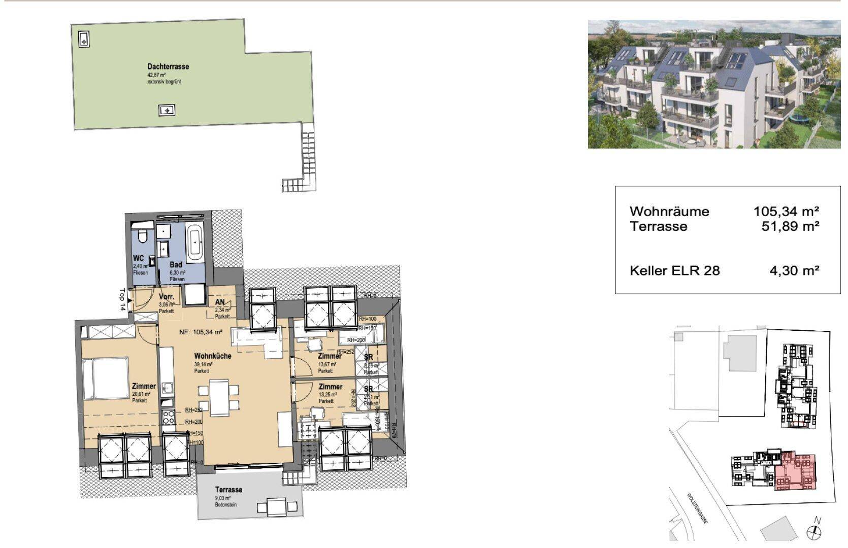 Die ca. 103 m² große Wohnung befindet sich im 3. Liftstock und teilt sich in drei Zimmer. Von der Wohnküche gelangt man direkt auf die Terrasse, von der aus ein Zugang zur Dachterrasse mit ca. 35 m² besteht. Bodentiefe Terrassenfenster sowie zusätzliche Dachfenster schaffen ein helles und freundliches Wohngefühl.