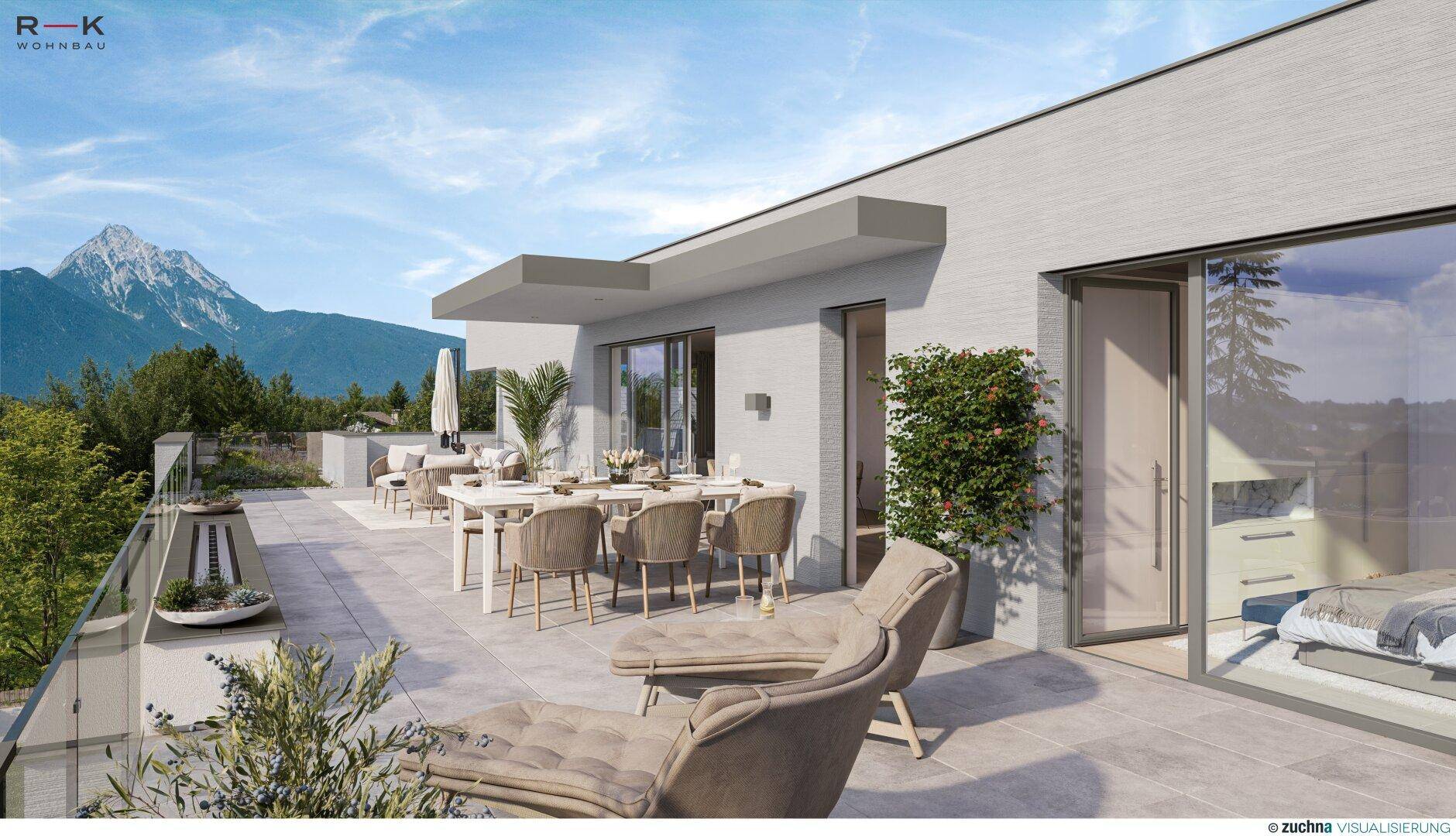 Dieses elegante Maisonette-Penthouse bietet auf zwei Geschosse mit ca. 146 m² Wohnfläche ein modernes Ambiente für gehobene Ansprüche. Der durchdachte Grundriss umfasst im Obergeschoss einen einladenden Vorraum, Hauswirtschaftsraum, Schlafzimmer mit Ankleide, WC und das elegante Badezimmer mit freistehender Badewanne und Dusche. Auf den ca. 20 m² großen Balkon gelangen Sie direkt über das Schlaf- und Badezimmer. Ins Dachgeschoss führt eine Treppe oder Sie fahren bequem mit dem Aufzug hoch mit privatem Zugang direkt in den Wohnraum. Hier befindet sich ein großer offener Vorraum, der direkt in den großzügigen ca. 54 m² großen Wohn-, Koch- und Essbereich übergeht. Zwei hochwertige Hebeschiebetüren eröffnen den Zugang zur Premium-Dachterrasse mit ca. 131 m² und extensiv begrünten Flächen im Ausmaß von ca. 47 m². Hier bietet sich ein herrliches Panorama mit bestem Blick auf die umliegenden Berge wie dem Gaisberg, Untersberg und Hohen Staufen. Auch das Gästezimmer ist mit einem direkten Zugang zur Terrasse ausgestattet. Ein Badezimmer mit Dusche und separates WC runden dieses exklusive Wohnerlebnis ab. Im Untergeschoss bietet das Kellerabteil mit ca. 17 m² zusätzlichen Stauraum. Zwei Tiefgaragenstellplätze sind dem Penthouse um je € 38.000,- zugeordnet.