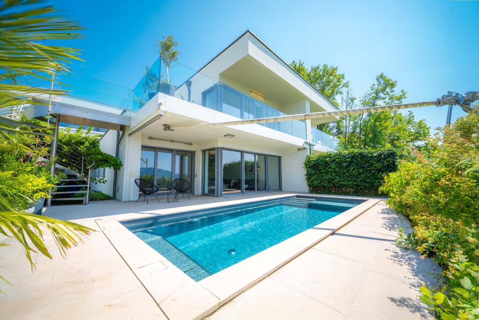 Die Immobilie vereint zwei eigenständige Wohneinheiten, die sich zu einer perfekten Ferienresidenz ergänzen. Im Erdgeschoss empfängt Sie ein großzügiger, lichtdurchfluteter Wohn- und Essbereich mit raumhohen Glasfronten, die den Blick ungehindert ins Freie lenken. Der Übergang in den Garten ist fließend – nur ein paar Schritte trennen Sie vom eleganten Salzwasserpool, der mit Abdeckung und Sonnensegel ausgestattet ist. Hier baden Sie unter der Sonne des Salzkammerguts, genießen den Sonnenuntergang mit einem Glas Wein oder lassen einfach die Seele treiben.