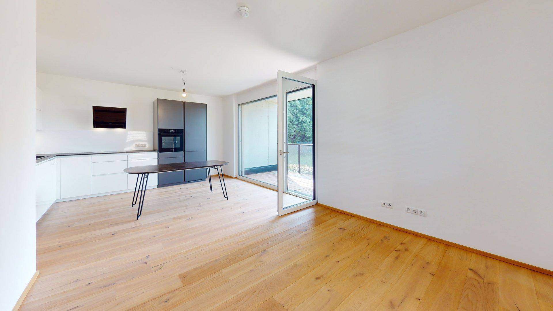 Die moderne Einbauküche von DAN und der große, nach Süden ausgerichtete Balkon sorgen für hohen Wohnkomfort und viel Tageslicht.