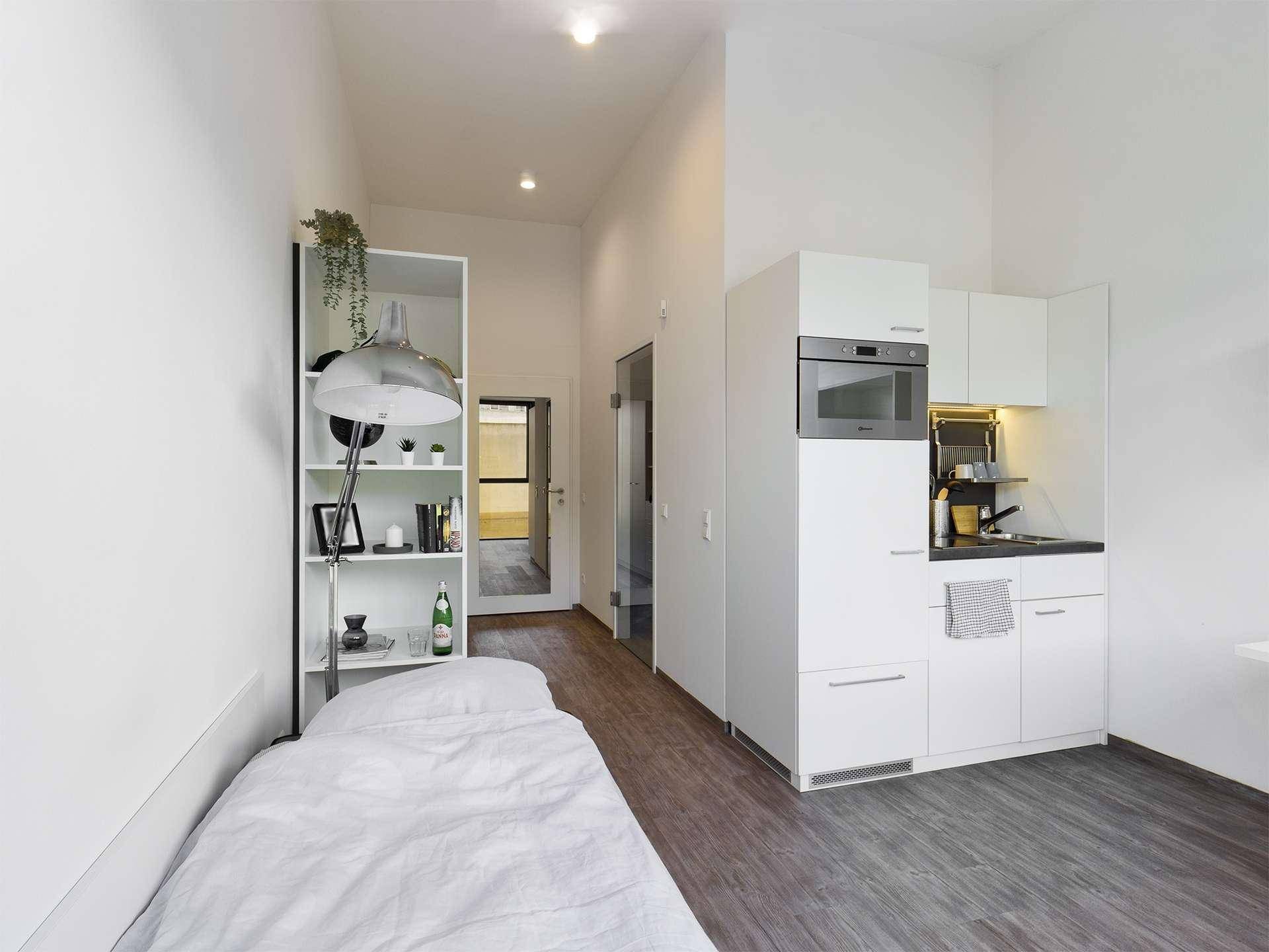 Kein Umzugswagen, kein Kistenschleppen – denn deine Bude ist schon komplett möbliert! Neben einer kleinen, aber feinen Pantry-Einbauküche erwarten dich ein hell gefliestes Bad mit bodengleicher Dusche, ein Bett sowie ein großzügiger Schreibtisch. Und die Lampen haben wir auch schon angebracht: Zieh einfach ein und freu dich auf dein startklares Apartment! Das Highspeed-WLAN darf natürlich auch nicht fehlen.