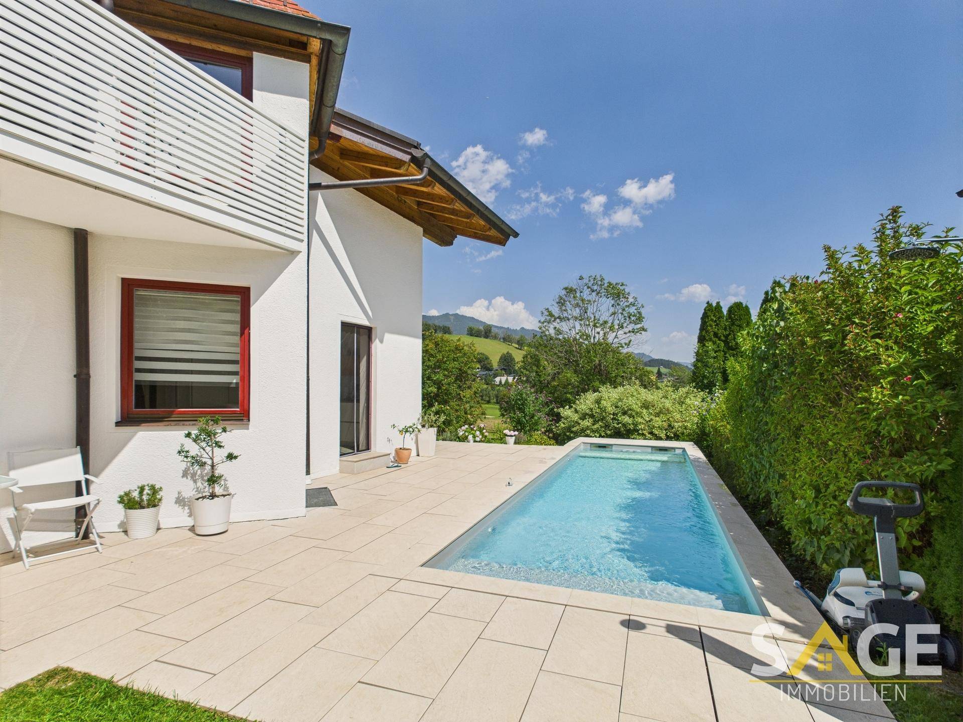 Foyer, Diele, Arbeitszimmer, 2 Kinderzimmer, Küche mit Essplatz, Gästetoilette Schlafzimmer, Wohnzimmer mit Kaminofen und Zugang zu 2 Balkonen, Tageslichtbadezimmer, separate Toilette Partykeller mit zusätzlichem Holzofen, Werkstatt, 3 Abstellräume, Technikraum Heizung: Erdwärme mit Flächenkollektoren Garage Pool mit Gegenstromanlage und Luftwärmepumpe für Poolheizung Whirlpool auf einem der Balkone