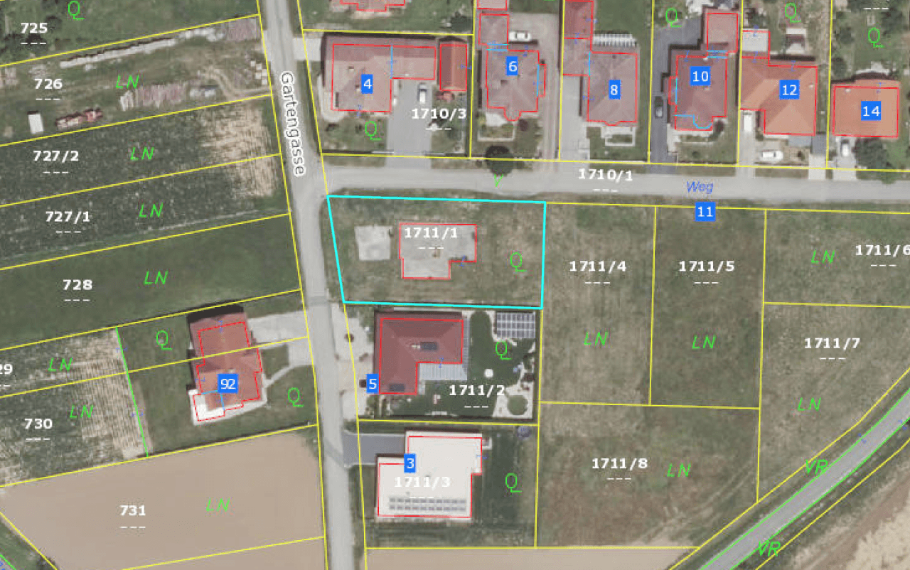 Das Baugrundstück in der Gartengasse hat 1.000 m2 und wird mit 15 EUR/m2 verkauft. Die auf dem Luftbild ersichtlichen Baureste wurden zwischenzeitlich entfernt.