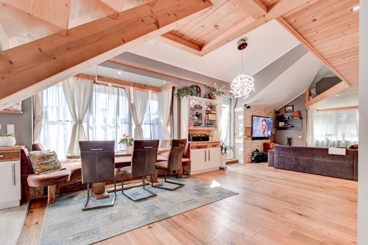 Willkommen in Ihrer neuen Dachgeschosswohnung im Herzen von Kufstein – einem wahrhaft exklusiven Wohntraum unter dem schützenden Schirm eines charakteristischen A-förmigen Satteldachs. Diese einzigartige Immobilie vereint urbanes Leben und alpines Panorama auf tolle Weise und bietet Ihrer Familie einen Wohnort, der nicht nur praktisch, sondern auch von besonderem Charme geprägt ist. Beim Betreten der Wohnung empfängt Sie ein großzügiger Eingangsbereich, der mit einer geräumigen Garderobe ausgestattet ist und direkt in den offenen Wohnbereich führt. Hier verschmelzen Küche, Essbereich und Wohnzimmer auf harmonische Weise miteinander. Der sichtbare Dachstuhl verleiht der gesamten Etage eine besonders einladende Atmosphäre und unterstreicht das charmante Flair dieser Dachgeschosswohnung.
