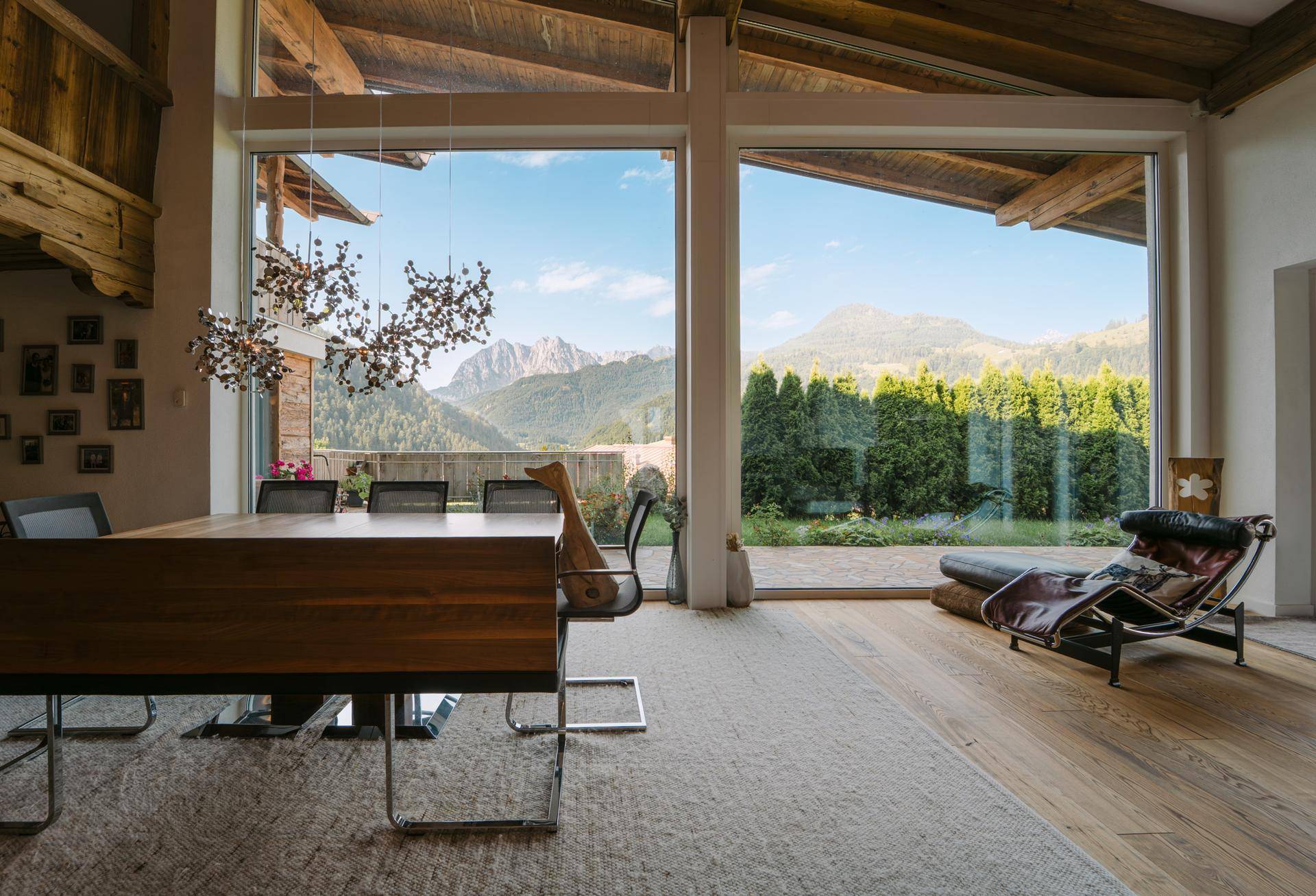 Im Erdgeschoss befindet sich das Herzstück der Villa: der ca. 86 m² große Wohn- und Essbereich mit großen Panoramafenstern, die einen traumhaften Blick auf den Wilden Kaiser gewähren und direkten Zugang zur Terrasse und Garten bieten. Die angrenzende geräumige Designerküche ist mit exklusiven Gaggenau-Geräten ausgestattet. Eine praktische Back-up-Küche bzw. Speisekammer, ein Hauswirtschaftsraum, ein separates Gäste-WC sowie zwei Schlafzimmer mit En-Suite-Bädern runden das Erdgeschoss ab. Ein Aufzug verbindet die untere Etage mit dem Obergeschoss barrierefrei.