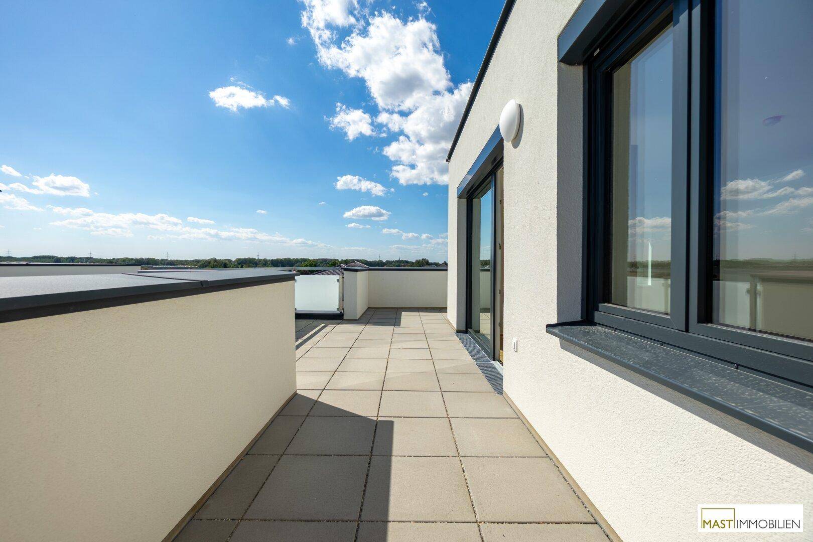 Eine optimal aufgeteilte 3 Zimmer Dachgeschosswohnung in Ausmaß von ca. 71,30 m² in südwestlicher Ausrichtung. Nach Eintritt in die Wohnung gelangen Sie ins Vorzimmer mit ca. 7,73 m². Das ca. 26 m² große Wohnzimmer bietet einen direkten Zugang auf die Dachterrasse im Ausmaß von knapp 22 m². Das Schlafzimmer ist ca. 12,32 m² groß und bieten daher ausreichend Platz für Ihre Möbel. Auch das Kinderzimmer mit ca. 10,89 m² bietet ausreichend Platz. Das modern & exklusiv gestaltete Badezimmer wird mit einer Wanne, WM-Anschluss und Waschbecken ausgestattet. Selbstverständlich ist das WC inkl. Handwaschbecken, separat begehbar. Der Abstellraum umfasst ca. 1,12 m².