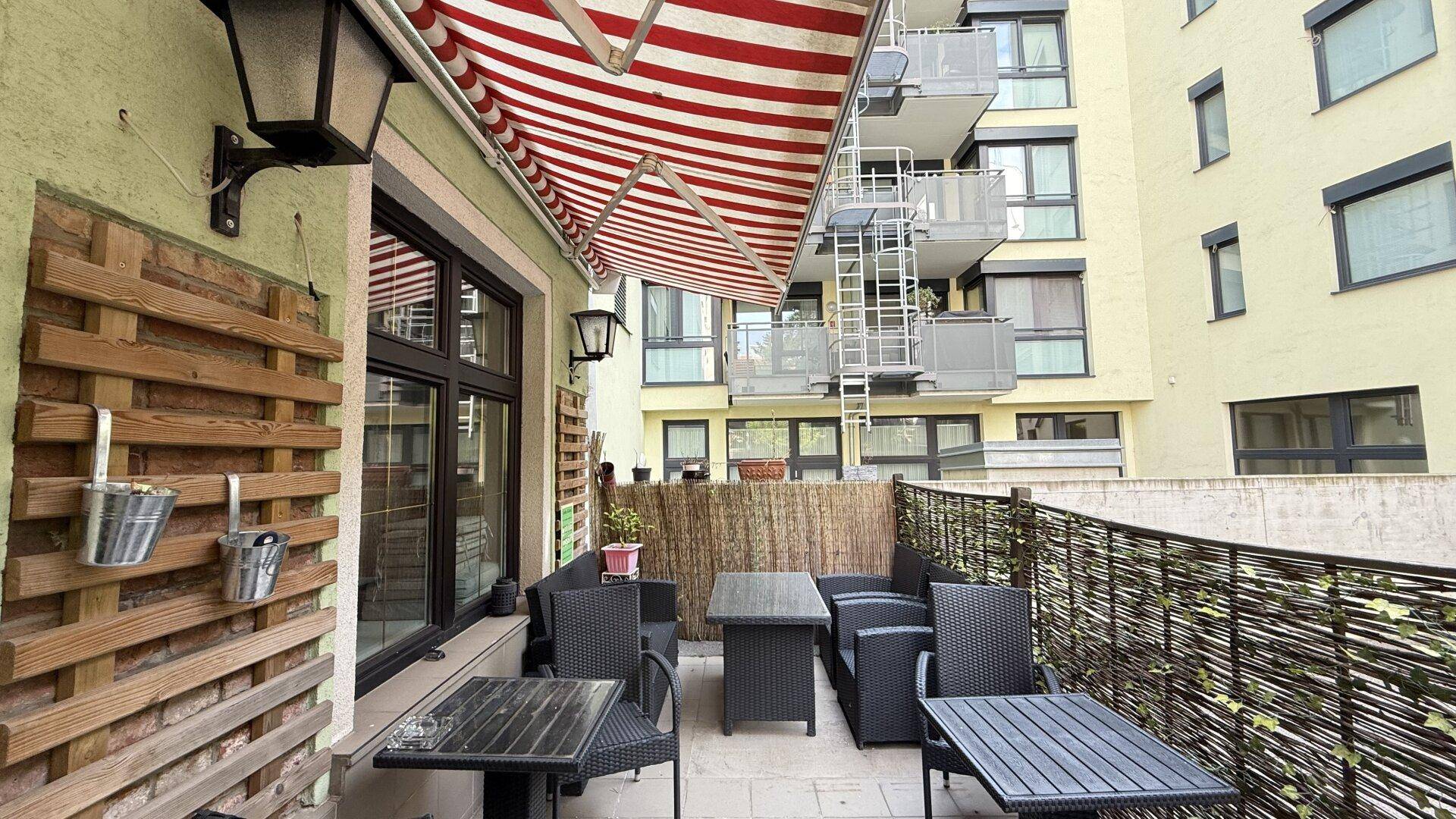 Die Terrasse (im Hof) ist bis 22:00 genehmigt und hier können auch 15 Personen platz finden. Ein Kellerabteil wird auch mitvermietet.