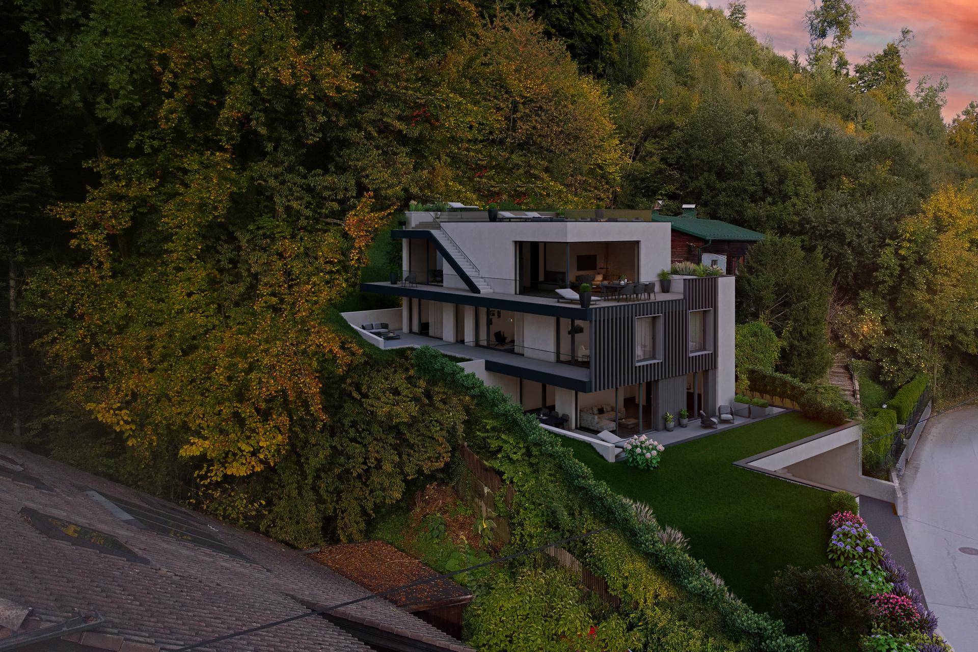 Villa 4ty-nine die neue Eleganz des Wohnens. Klare Formen und natürliche Materialien harmonieren mit minimalistischer Architektur auf ganzer Linie. Die großzügigen Zimmer und offenen Wohnbereiche im oberen Teil des Hauses schaffen eine einzigartige Wohnatmosphäre, in der die umgebende Natur, das beeindruckende Panorama und die praktische Lage perfekt aufeinander abgestimmt sind. Die Villa 4ty-nine wurde bewusst als Hauptwohnsitz konzipiert, um Ihrer Familie ausreichend Raum zur persönlichen Entfaltung zu geben. Die intelligent integrierte Einliegerwohnung bietet zusätzlich zahlreiche Möglichkeiten, um Ihren individuellen Bedürfnissen flexibel zu begegnen.