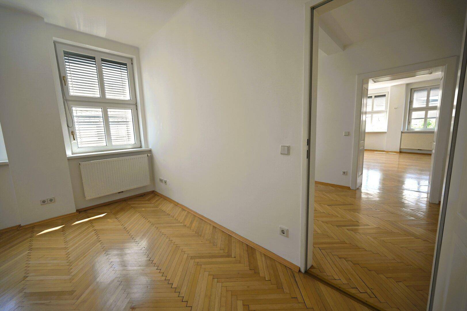 Drei lichtdurchflutete Zimmer mit hochwertigem Parkett schaffen eine angenehme, repräsentative Arbeitsatmosphäre. Große Fensterfronten sorgen für optimale Belichtung und eröffnen einen beeindruckenden Blick über die Stadt.