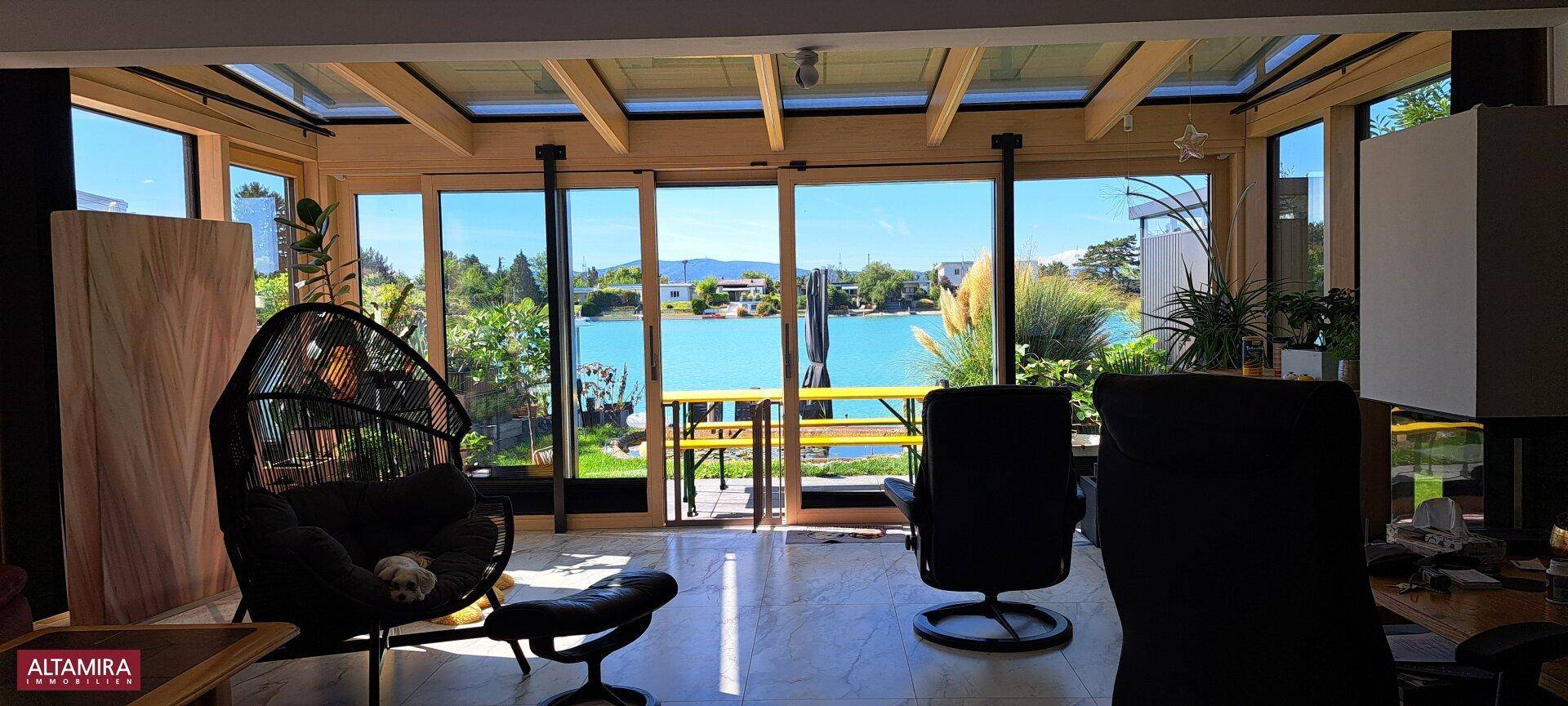 Dann ist dieses hochmoderne Haus für Sie genau richtig. Errichtet vor 4 Jahren in den stylischen Farben weiß und anthrazitgrau. Die großzügige Glasfront mit Wintergarten und Blickrichtung See bringt die Natur und das Wasser mitten in ihrem Lebensbereich. Hier lässt es sich wohnen und leben im Freien am kühlen Wasser mit Blick auf 110.000 m² Wasser und dem Wienerwald hervorragend verbinden. Genießen Sie beim Morgenkaffee die Stille, die dieser See ausstrahlt. Es ist wie ankommen zu sich selbst auf diesem paradiesischen Fleckchen Erde. Mit der topausgestatteten großzügigen Wohnküche mit Kochinsel und direktem Blick auf den See macht das Kochen doppelt so viel Spaß.