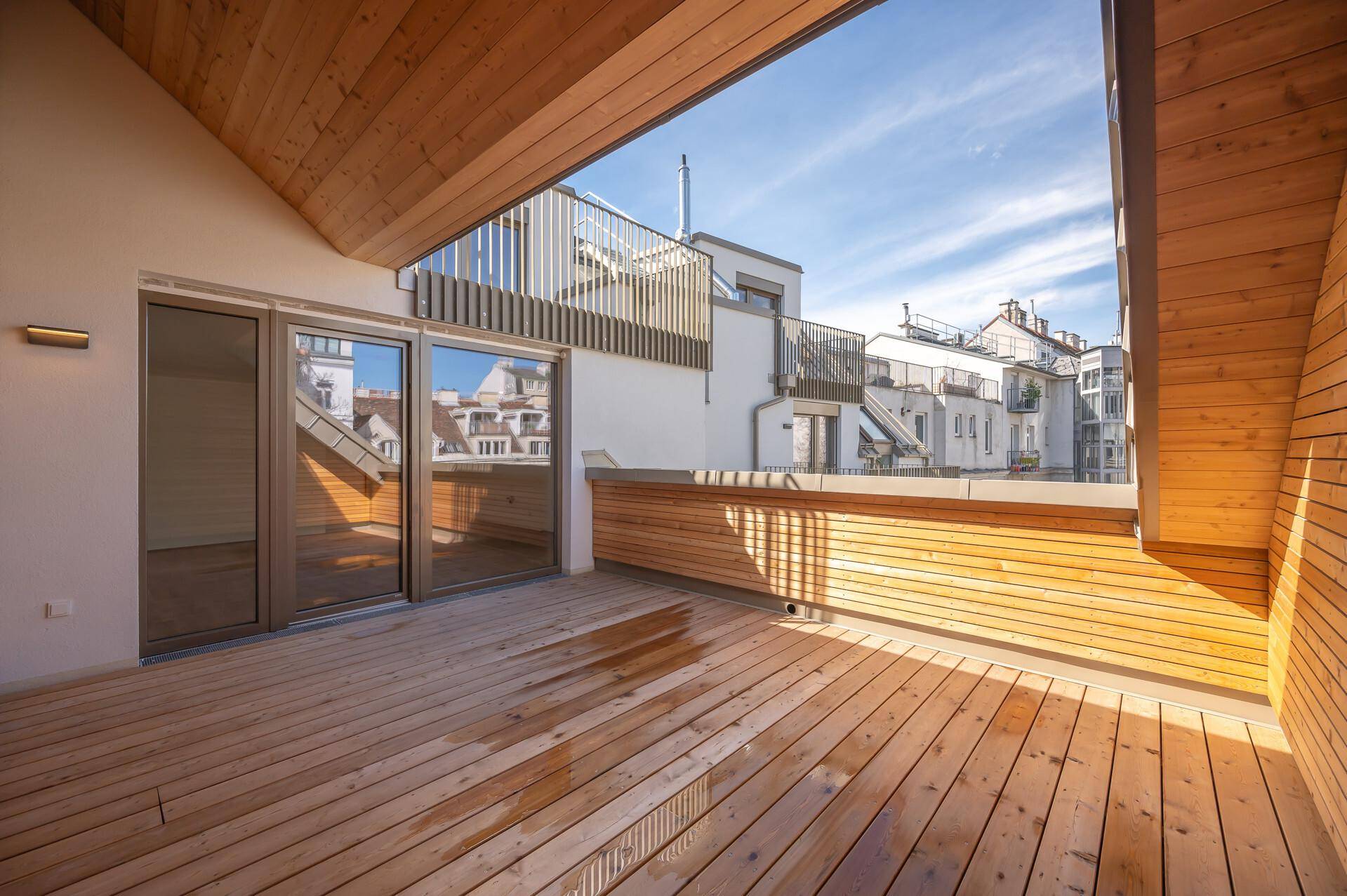 Ob für die junge Familie oder all jene, die einen extra Raum fürs Homeoffice benötigen: Diese im Dachgeschoss gelegene Wohnung ist ein echter Allrounder und punktet mit exklusivem Flair und gut durchdachtem Grundriss. Vom großen, lichtdurchfluteten Wohlfühl-Wohnzimmer geht es hinaus auf die beeindruckende, teils überdachte 22 m² große Terrasse in Hofruhelage – ideal für ein Outdoor-Mittagessen bei strahlendem Sonnenschein!