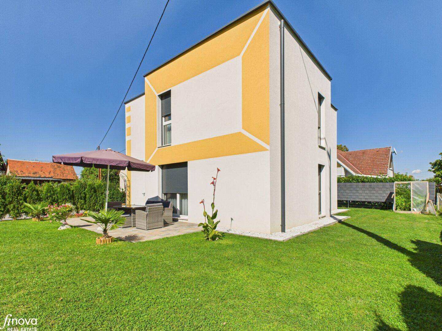 Im Erdgeschoss empfängt Sie ein heller Vorraum, von dem aus alle Räume zugänglich sind. Das Herzstück bildet der offene Wohn- und Essbereich mit moderner Küche, der durch große Fensterflächen lichtdurchflutet ist und direkten Zugang zur sonnigen Terrasse bietet. Ergänzt wird das Erdgeschoss durch ein Büro, das sich auch als Gästezimmer eignet, ein Badezimmer mit Dusche sowie einen praktischen Abstellraum.