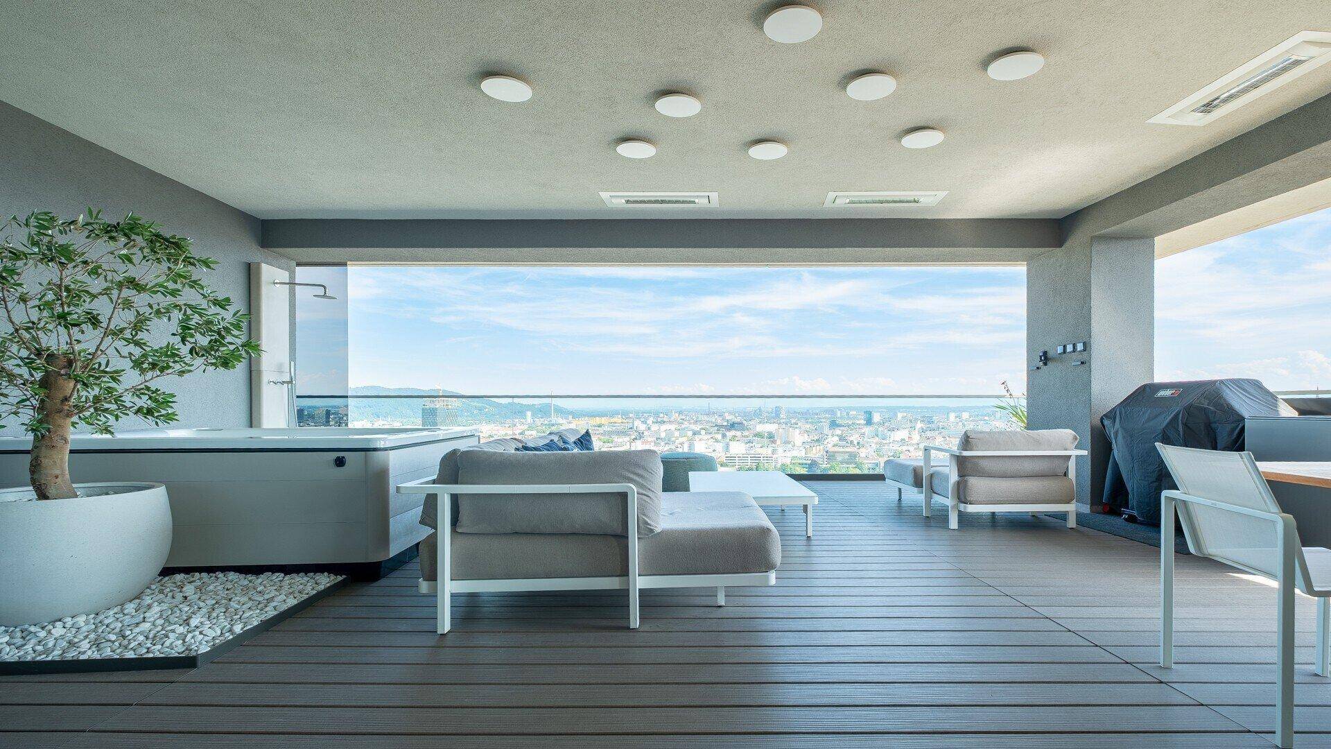 Einzigartig ist die großzügige, sonnige Terrasse – ein exklusiver Freiraum hoch über der Stadt, der keine Wünsche offenlässt. Hier genießen Sie nicht nur den spektakulären Panoramablick über Linz, sondern auch eine Ausstattung, wie man sie sonst nur aus Luxushotels kennt.