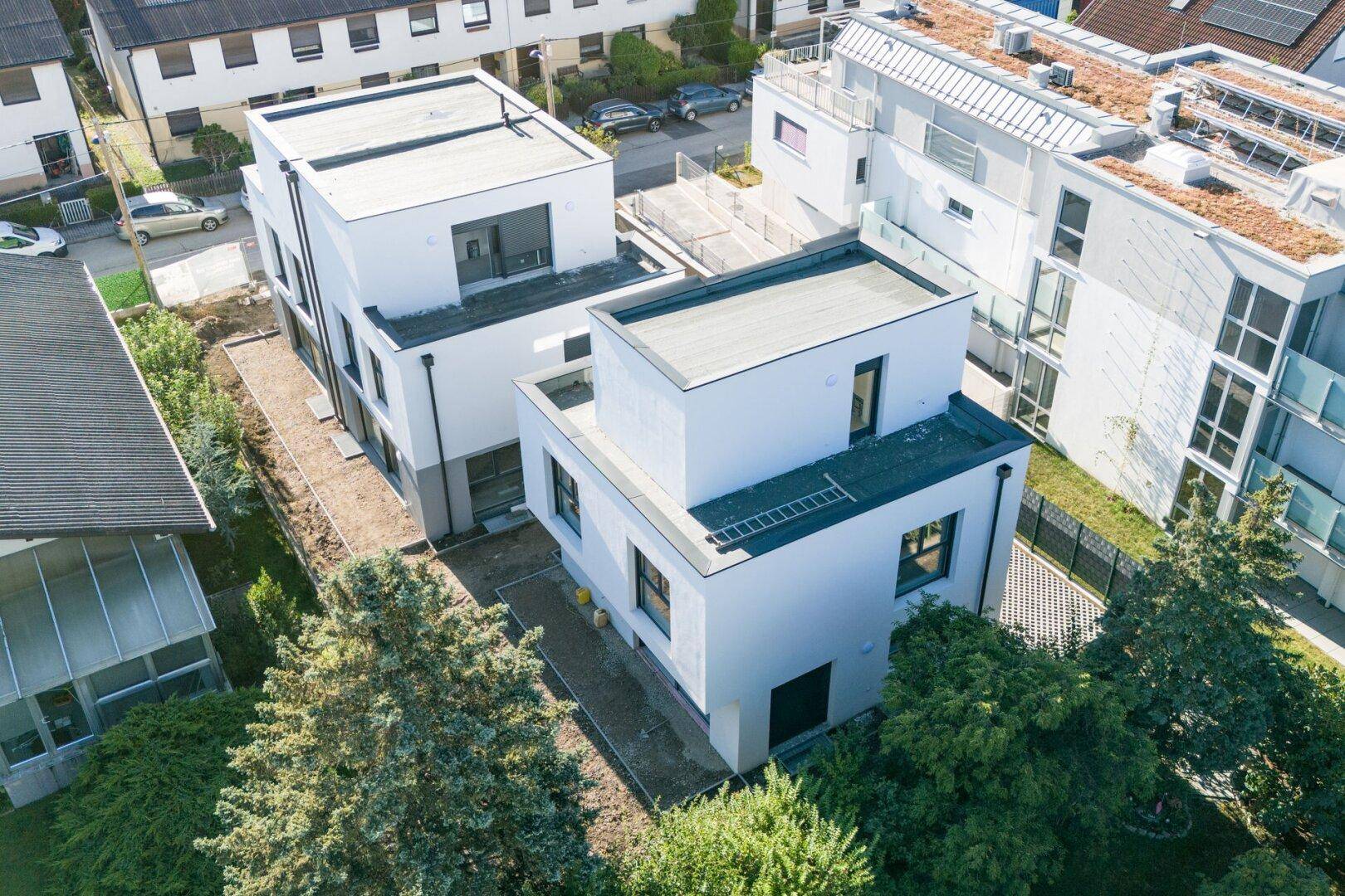Zum Verkauf stehen zwei exquisite Doppelhaushälften mit jeweils etwa 117 m² Wohnnutzfläche. Die Garten- und Terrassenflächen im Erdgeschoß umfassen ca. 41 m² und 51 m², mit einer Dachterrasse von ca. 14 m². Beide Häuser bieten großzügigen Wohnkomfort durch ideale Raumaufteilung, genügend Stauraum und offene Räume, die ein einladendes und lichtdurchflutetes Ambiente schaffen. Diese Luxusimmobilien begeistern zudem mit Außenflächen und einem naheliegenden Parkplatz.