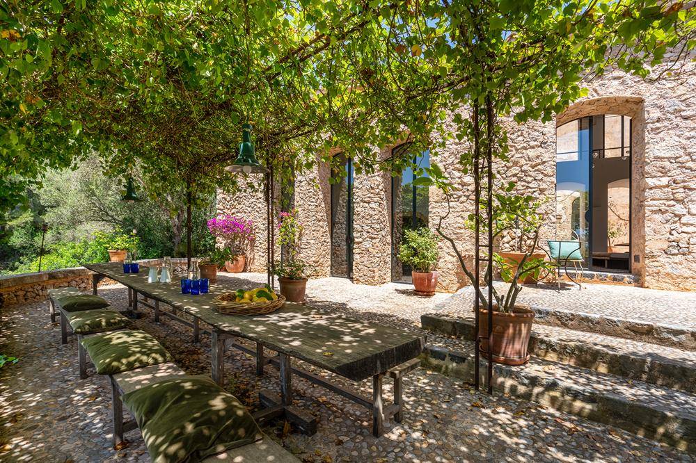 Sobald man das Anwesen betritt, umgibt einen das Gefühl, sich in einer anderen Welt zu befinden. Der einladende Eingangsbereich führt zu einem urigen Kaminbereich und linkerhand befindet sich ein offener Arbeitsraum. Über originales Felsgestein gelangt man in die offene Küche, welche einen alten mallorquinischen Backofen und eine gemütliche, in den Fels integrierte Sitzecke beherbergt.