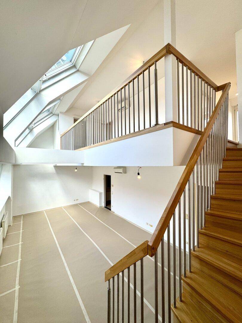 Über die Treppe im Wohnzimmer gelangen Sie in die Galerie, die sich flexibel als Arbeits- oder Loungebereich nutzen lässt. Von hier aus sind zwei weitere Schlafzimmer, ein Badezimmer sowie eine hofseitig ausgerichtete Terrasse zugänglich. Diese bietet Ruhe und Privatsphäre mitten in der Stadt.