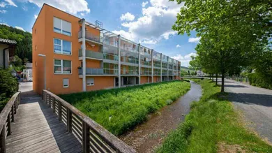 KIRCHSCHLAG, WO MAN GERN DAHEIM IST. In der größten Gemeinde der Buckligen Welt gehen Natur und Kultur Hand in Hand: Wiesen und Wege und das renovierte „Burgbad“ vor der Haustür, ein reges Kultur- und Vereinsgeschehen im Ort. Kindergarten, Volksschule und NMS sind so nahe, dass die Devise gilt: „zu Fuß“ statt „per Bus“. Direkt am Zöbernbach gelegen, sind die 24 familienfreundlichen Wohnungen ab 62 bis 91 m² durchwegs mit Balkon und Kellerabteil ausgestattet. Der Platz ums Haus gehört den Bewohnern: Der PKW-Stellplatz für jede Wohnung liegt in der Tiefgarage! Angaben Gesamtmiete excl. Heizkosten, inkl. Betriebskosten-Akonto, inkl. PWK-Stellplatz. Alle Wohnungsangebote finden Sie auf unserer Homepage: www.alpenland.ag.