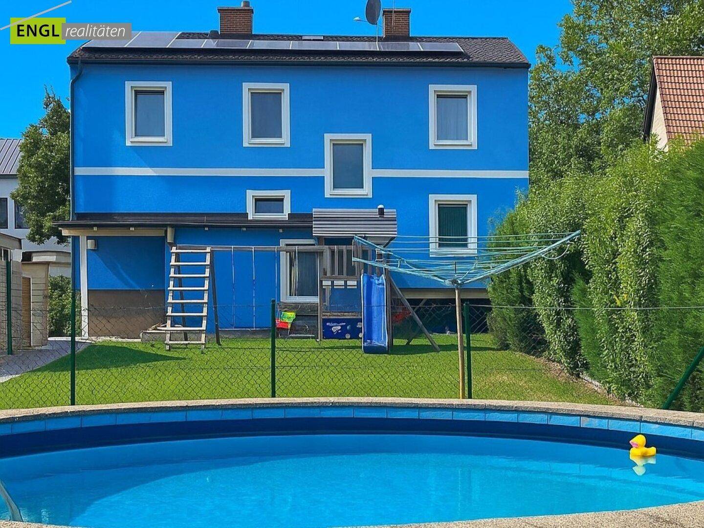beheizbare Swimmingpool im hinteren Gartenbereich, inklusive