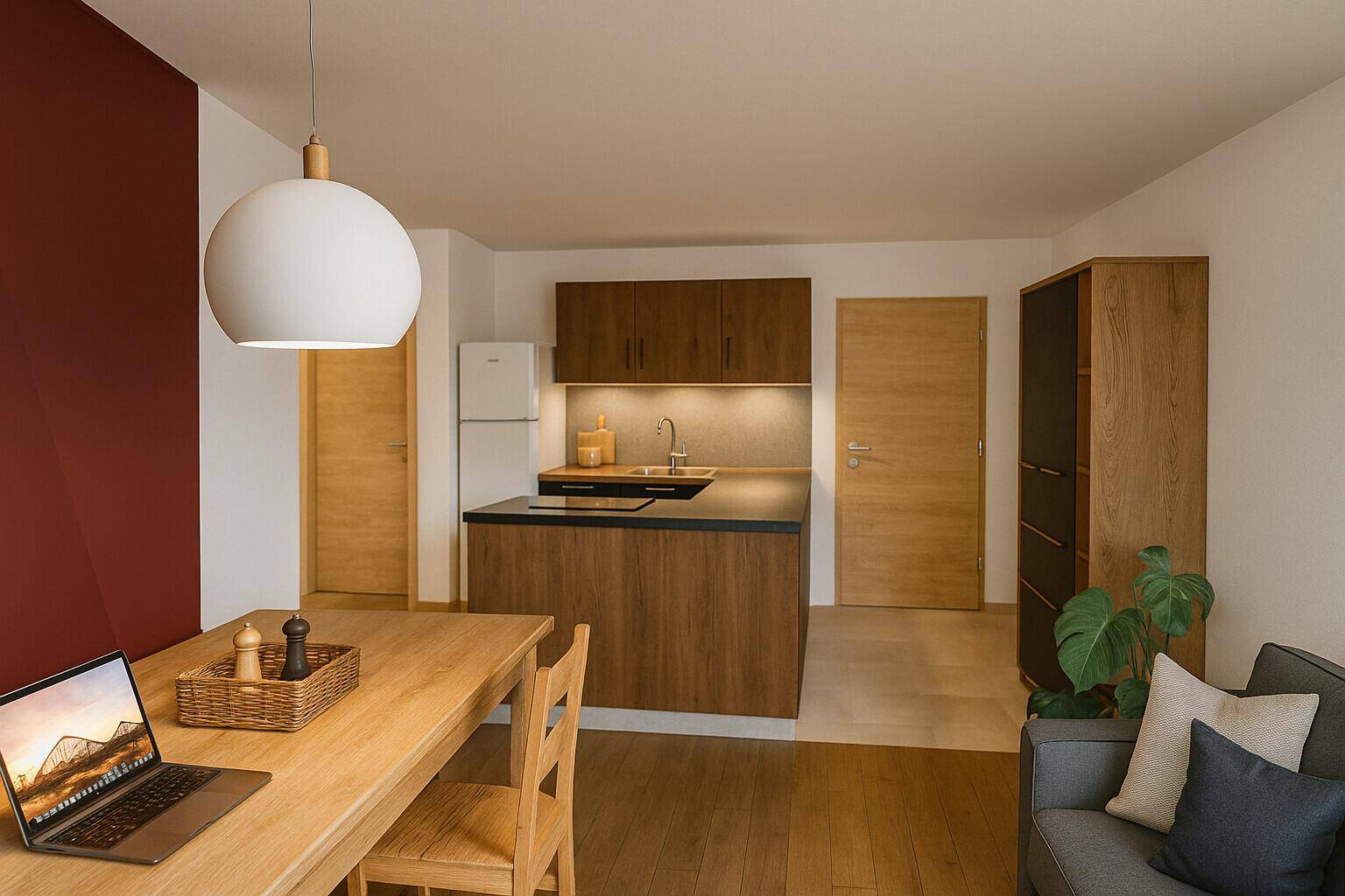 Auf 57,16 m² Wohnfläche überzeugt die Wohnung mit einem durchdachten Grundriss. Der offene Wohn- und Essbereich bildet das Zentrum und bietet direkten Zugang zur 14,71 m² großen Terrasse sowie zum 43,15 m² großen Garten.