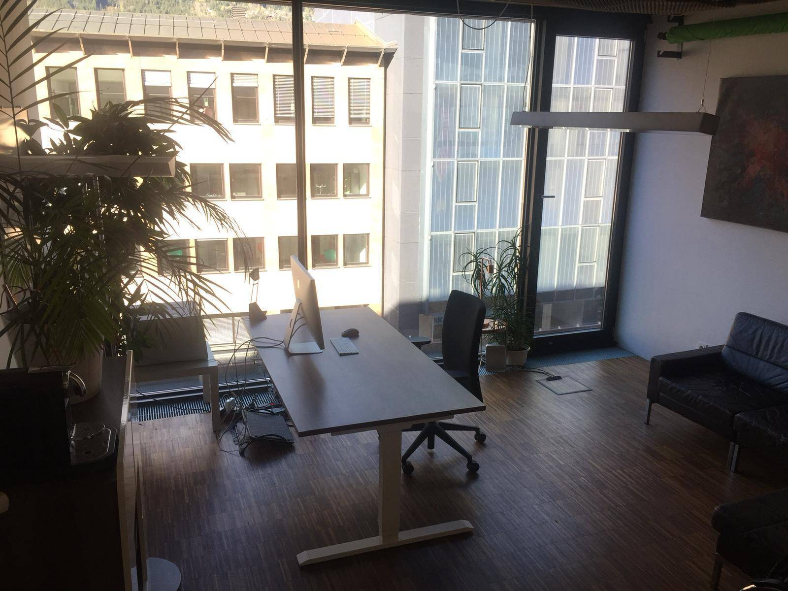 Modernes Büro Für 1, 2 oder sogar 3 Personen - je nach Bedarf und Gestaltung (zB Co-Working deluxe) Sitz-Besprechungs-Eck-Couch Holz-Hochkant-Parkett Großer Schreibtisch (120/80) WC / Bad 24/7 Zugang 100% hell, raumhohe Fenster perfekte Temperaturregelung