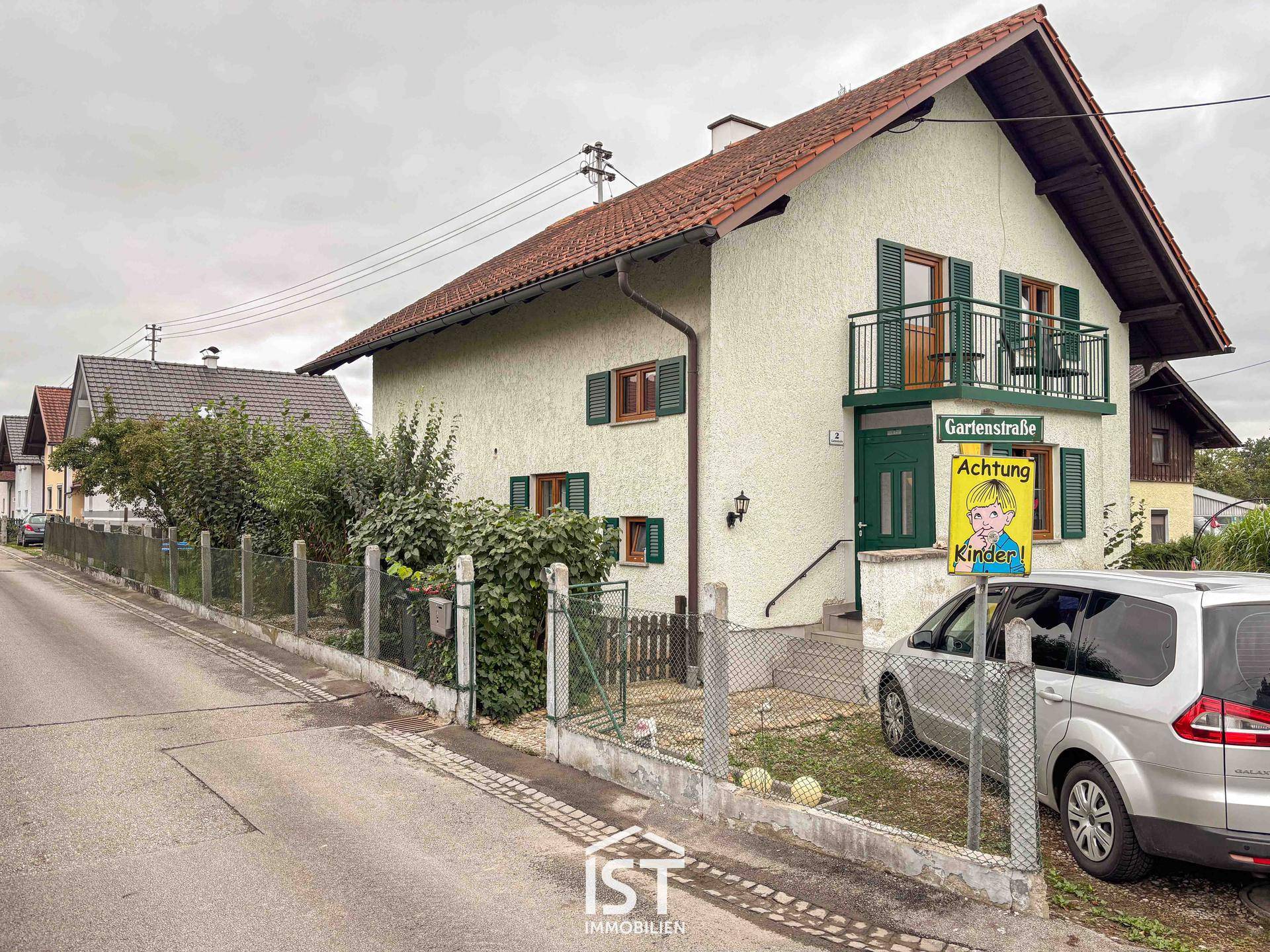 Im Obergeschoss erwarten Sie drei weitere Zimmer, eines davon als Durchgangszimmer. Über den Vorraum gelangen Sie zudem auf den Balkon, eine kleine Nische bietet zusätzlichen Stauraum. Das Haus ist voll unterkellert, wobei der Keller sowohl vom Erdgeschoss als auch vom Garten aus zugänglich ist – ideal für Vorräte, Hobby oder Werkstatt. Der Garten lädt zum Entspannen ein und bietet vielfältige Gestaltungsmöglichkeiten. Beheizt wird die Immobilie über eine Fernwärme-Zentralheizung. Ein PKW-Stellplatz im Zufahrtsbereich ergänzt das Angebot.