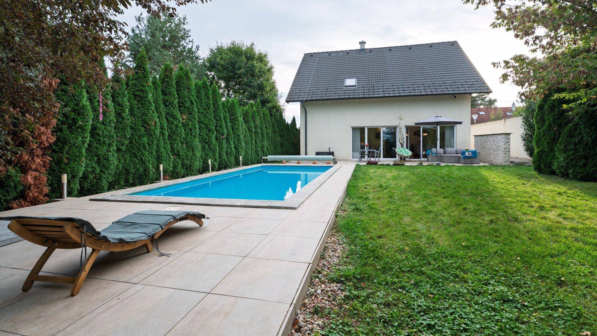 Ein besonderes Highlight ist das Pool, das rundum verfliest ist und für Urlaubsfeeling im eigenen Zuhause sorgt. Zusätzlich gibt es einen Brunnen, der von Thujen verdeckt wird.