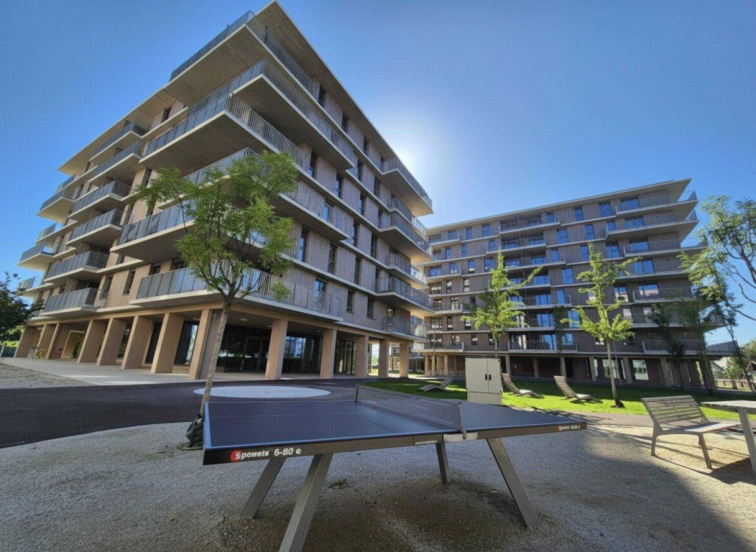 Ein großzügig gestalteter Innenhof mit gepflegten Grünflächen bietet Platz für Entspannung und nachbarschaftlichen Austausch. Zudem steht eine moderne Tiefgarage zur Verfügung, die das autofreie Konzept optimal ergänzt.