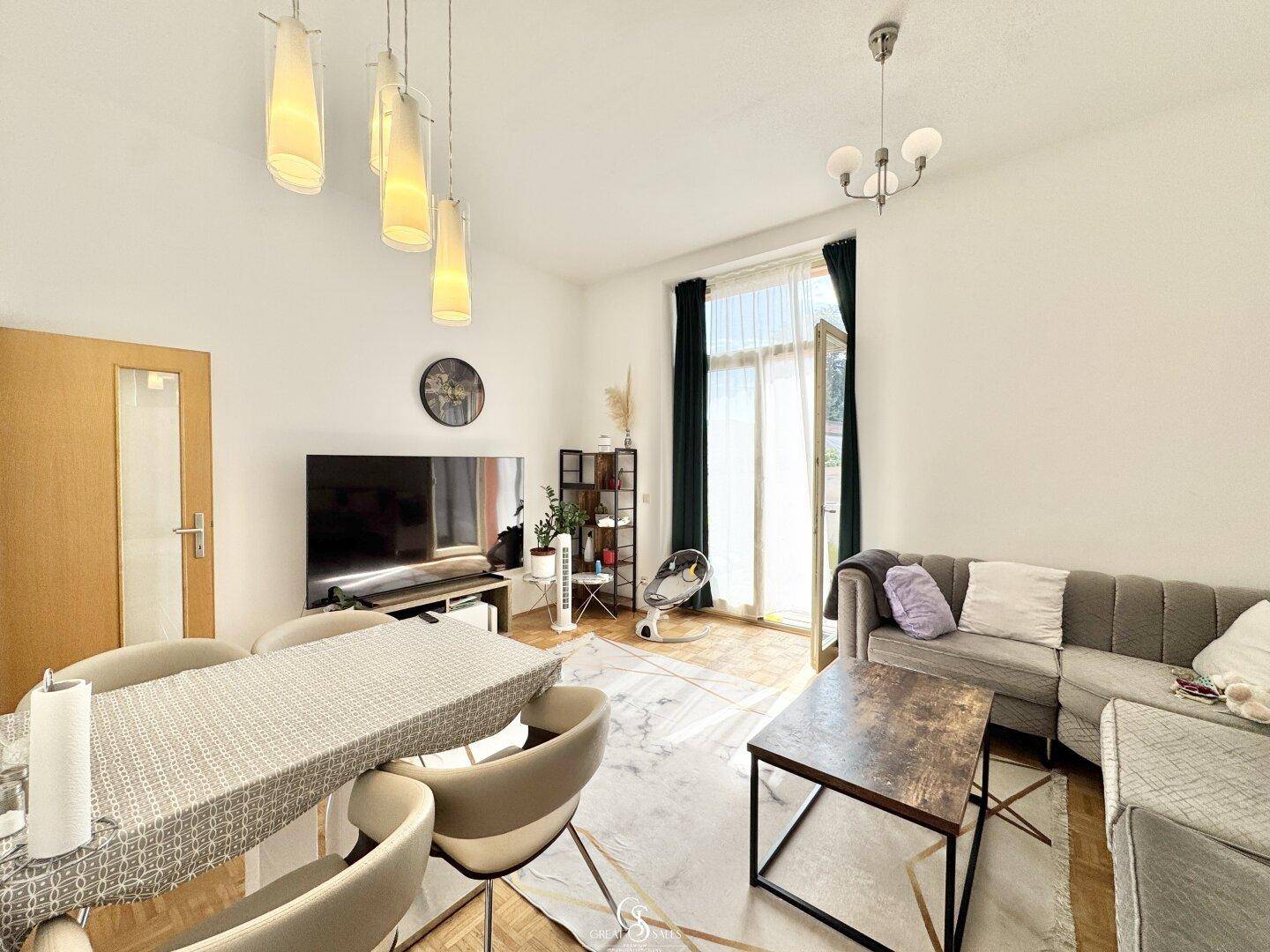 Die durchdachte Raumaufteilung in Kombination mit der hohen Raumhöhe sorgt für ein besonders angenehmes Wohngefühl. Alle Räume sind vom zentralen Vorraum aus direkt begehbar. Das helle Wohn- und Esszimmer mit Zugang zum sonnigen Süd-Balkon (ca. 8,10 m²) bildet das Herzstück der Wohnung und lädt zum Genießen kulinarischer Momente ebenso wie zu entspannten Stunden im Freien ein.
