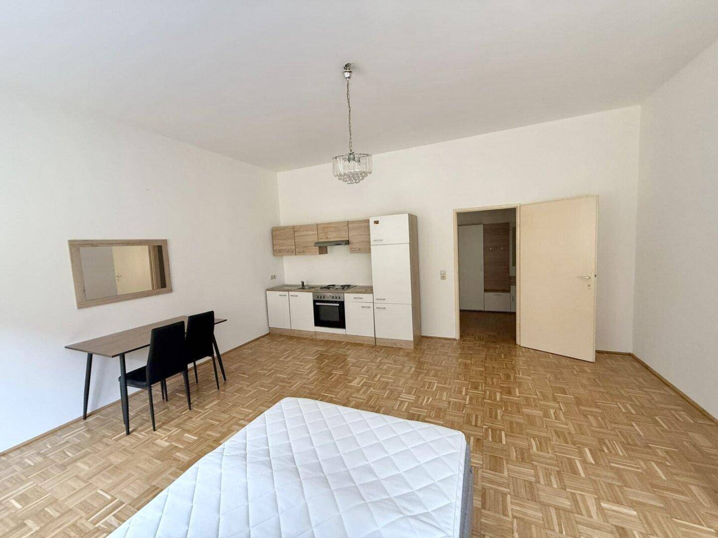 Diese helle und gut geschnittene Mietwohnung bietet ca. 40 m² Wohnfläche und besteht aus Vorraum, Bad/WC, Wohn-/Ess/Schlafbereich mit integrierter Küche und neuen Möbel (Bett, Schrank, Esstisch, Garderobe).