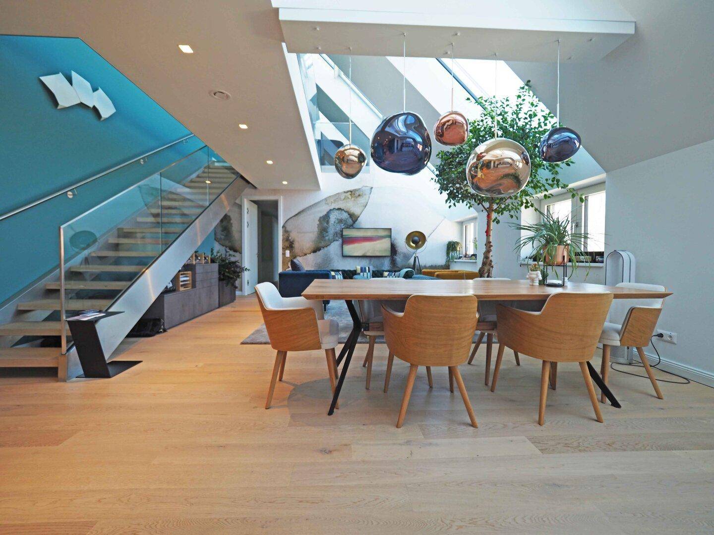 - Wohnzimmer mit offener Küche (ca. 58 m²) und Stiege zur zweiten Ebene | living room with open kitchen (approx. 58 m²) and stairs leading to the 2nd level of the apartment