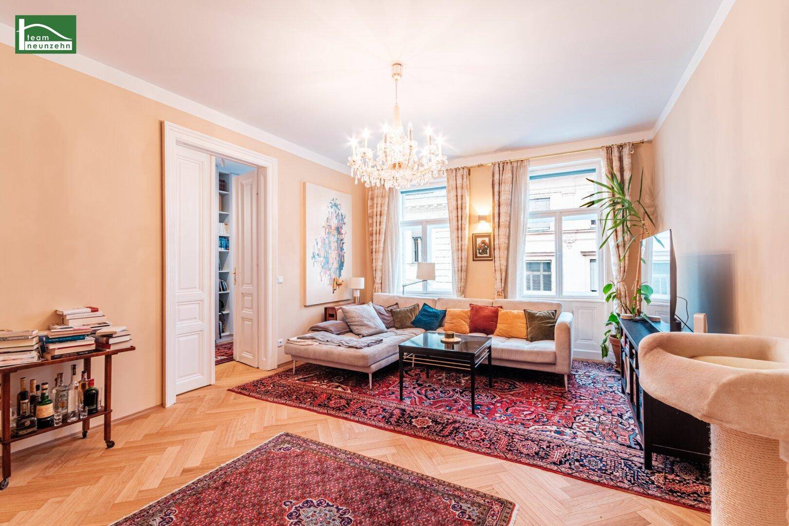 Inmitten des begehrten 9. Wiener Gemeindebezirks, nur wenige Schritte vom Donaukanal, dem beliebten Servitenviertel und der U4-Station Friedensbrücke entfernt, erwartet Sie diese stilvoll kernsanierte 4-Zimmer-Eigentumswohnung mit rund 94,65 m² Wohnfläche im vierten Liftstock eines gepflegten Altbaus aus 1892.