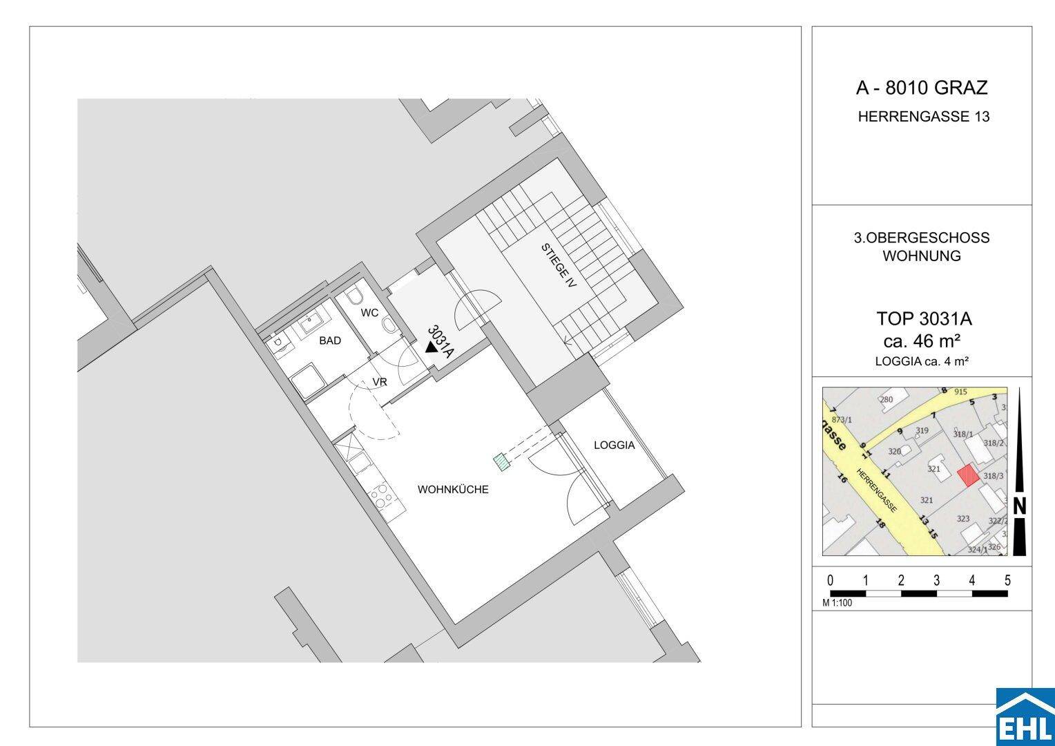 Die Wohnung selbst befindet sich im 3. Obergeschoss und gliedert sich in eine geräumige Wohnküche mit Schlafbereich, ein Badezimmer mit Dusche und Waschmaschinenanschluss, ein separates WC, sowie einen Vorraum. Die Loggia rundet das Wohnerlebnis perfekt ab.
