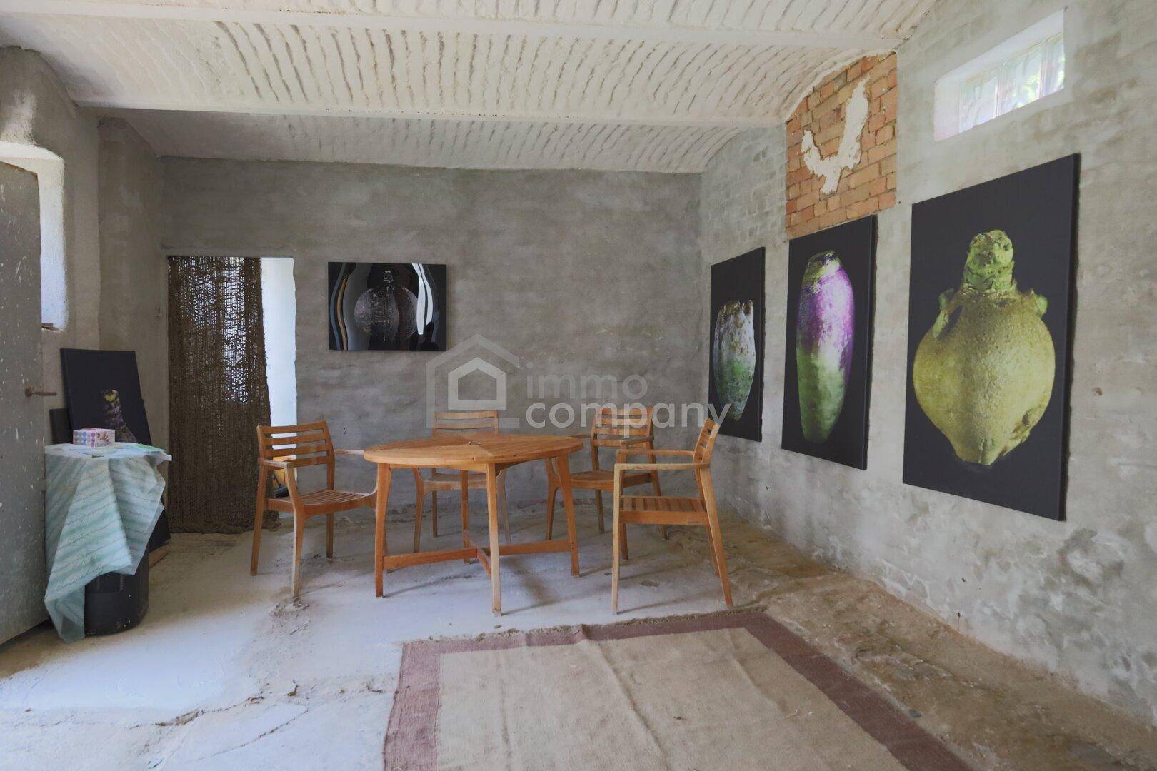 Die ehemaligen Stallungen wurden entkernt und zu einem großzügigen Raum umgestaltet – ideal als Atelier oder Werkstatt