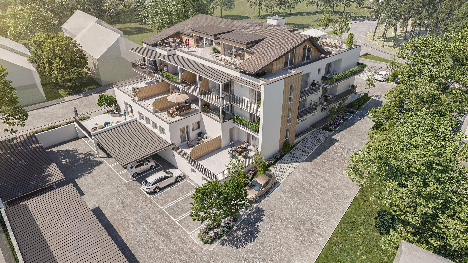 Die Wohnungen werden über ein offenes Stiegenhaus mit Laubengängen sowie einem barrierefreien Aufzug erschlossen und verfügen über helle und großzügige Räume sowie geräumige Balkone, Balkonterrassen bzw. Terrassen. Weiters verfügt jede Wohnung über ein eigenes Kellerabteil. Stellplätze im Freien als auch überdacht können optional erworben werden. Ebenso werden Besucherparkplätze, ein Müllraum und Fahrradabstellplätze errichtet.