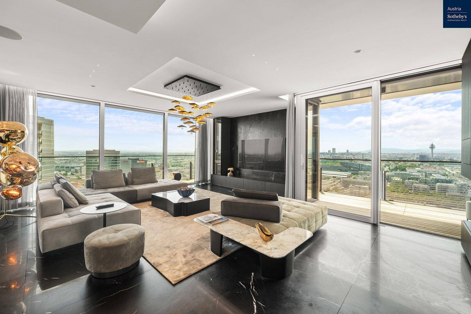Willkommen in einem einzigartigen Penthouse, das neue Maßstäbe in Sachen Luxus und Design setzt und keine Wünsche offen lässt. Diese exklusive Wohnung befindet sich in den renommierten TrIIIple-Towers und bietet auf über 100m Höhe eine atemberaubende Aussicht über ganz Wien mit herrlichem, weitläufigem Blick bis zum Kahlenberg, etliche Sehenswürdigkeiten der Stadt sowie teilweise den grünen Prater. Ein unvergleichliches Wohngefühl erwartet Sie, das durch sorgfältig ausgewählte Materialien, modernste Technik und individuelle Gestaltung hervorsticht. Dieses ca. 160m² große Penthouse bietet alles, was das Herz begehrt: Einen großzügigen Wohn-Essbereich mit ca. 70 m² und einer Raumhöhe von über 2,70m, zwei Schlafzimmer, ein begehbarer Schrankraum, zwei Bäder, sowie ein separates Gäste-WC im Vorraum, ein Arbeitszimmer, zwei Abstellräume und einen umlaufenden über 47 m² großen Balkon.