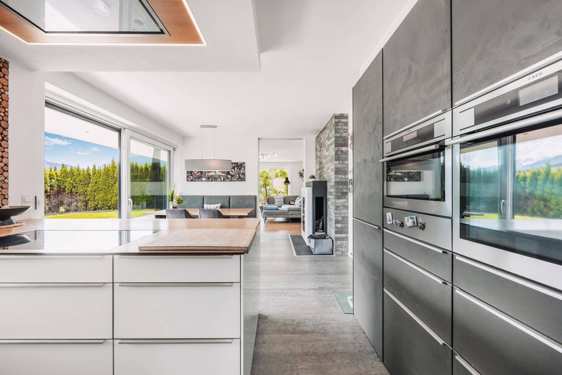 Im Südöstlichen Teil des Erdgeschosses ist auch die moderne Küche mitsamt dem Esszimmer zu finden. Große Glasfronten und eine tolle Hebeschiebetüre erhellen den Raum maximal und bieten viel Platz zum Kochen, Speisen, Leben. Die Markenküche ist neuwertig und verbleibt samt der verbauten Elektrogeräte im Objekt. Ein Kamin ist für die kühlen Übergangstage verbaut worden um wohlige Wärme zu spenden. Generell ist das Haus aber so hochwertig erbaut worden, dass man nahezu auf die Heizung verzichten kann.