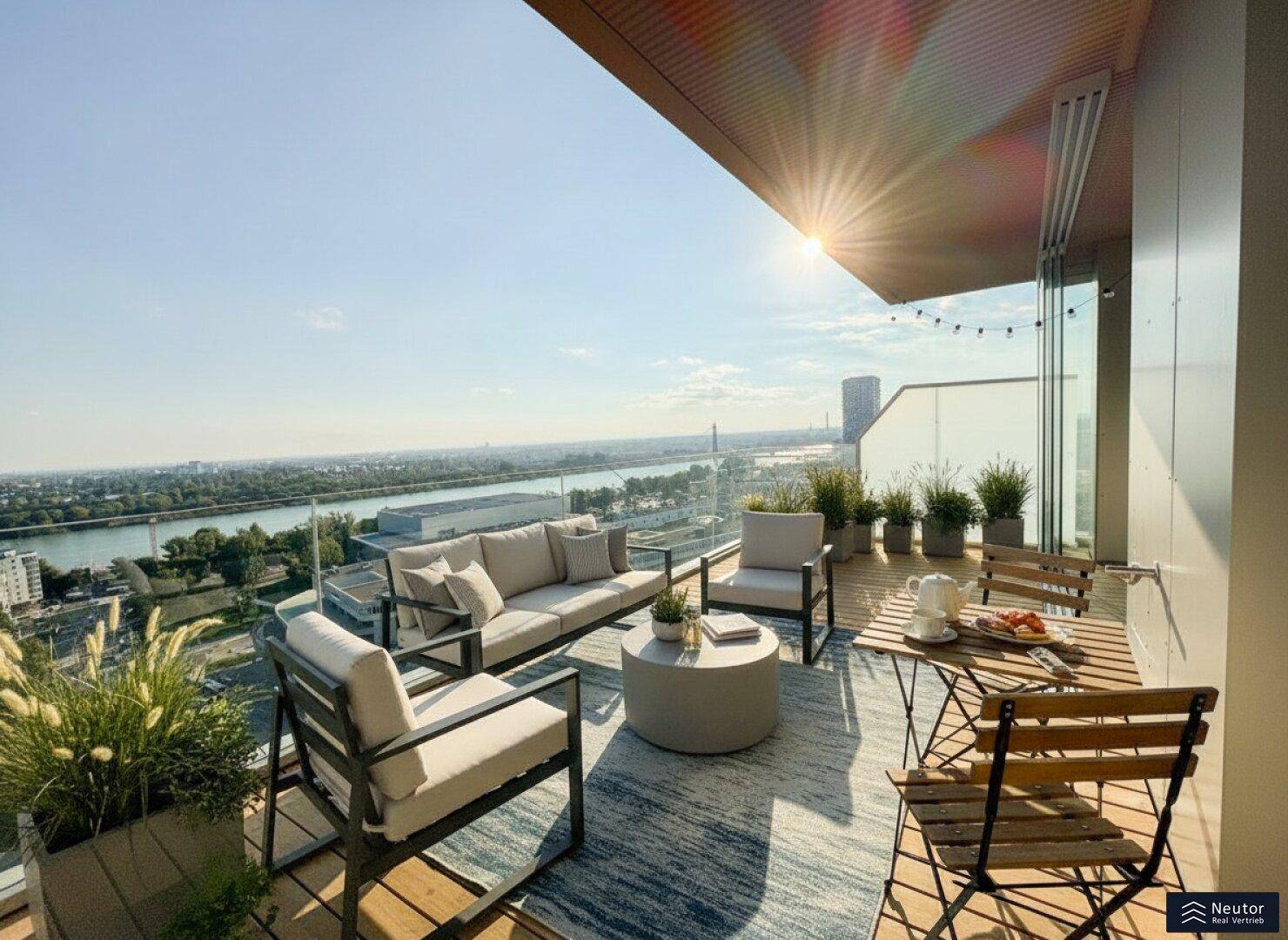 In einer der exklusivsten Lagen Wiens, im pulsierenden und dennoch grünen „Viertel Zwei“, wo urbanes Leben und beruhigende Oasen eine perfekte Symbiose eingehen, erhebt sich das Prestigeprojekt Grünblick. Ein Ort an dem anspruchsvolles Wohnen neu definiert wird. Im 20. Stock dieses architektonischen Meisterwerks erwartet Sie eine vollmöblierte Wohnung, die Eleganz, Komfort und atemberaubende Panoramablicke auf eindrucksvolle Weise vereint. Der offene Wohnbereich mit raumhohen Glasfronten öffnet den Blick auf die Dächer Wiens, ein funkelndes Lichtermeer bei Nacht, ein leuchtender Sonnenuntergang am Abend oder die ersten Strahlen der Morgensonne. Jeder Moment wird hier zu einem unvergesslichen Erlebnis. Ein großzügiger Balkon und eine elegante Loggia erweitern den Wohnraum nach außen und laden ein, die Magie der Stadt aus einer neuen Perspektive zu genießen. Sei es bei einem entspannten Morgenkaffee bei den ersten Sonnenstrahlen oder einem Glas Wein unter dem funkelnden Sternenhimmel. Diese Außenbereiche sind der perfekte Ort, um zur Ruhe zu kommen oder Gäste stilvoll zu empfangen. Die Wohnung selbst ist ein Statement für zeitlose Ästhetik und modernste Technik. Mit Liebe zum Detail eingerichtet, vereint sie edles Eichenparkett, Naturstein und hochwertige Textilien zu einer warmen, einladenden Atmosphäre, die Luxus auf subtile Weise widerspiegelt. Eine vollausgestattete Küche, ein elegantes Schlafzimmer sowie Annehmlichkeiten wie Fußbodenheizung, Deckenkühlung und ein intelligentes Smart-Home-System lassen keine Wünsche offen. Diese Ausstattung erfüllt höchste internationale Standards und sorgt für Komfort zu jeder Jahreszeit. Ein exklusiver Concierge Service steht Ihnen täglich zur Verfügung und kümmert sich um Ihre individuellen Anliegen, von der Organisation von Reinigungsservices über Tischreservierungen bis hin zur Annahme von Lieferungen. Bereits die stilvoll gestaltete Lobby heißt Sie in einem Ambiente auf höchstem Niveau willkommen. Hier stehen Ihnen moderne Co-Working-Möglichkeiten zur Verfügung, ideal für konzentriertes Arbeiten in repräsentativer Umgebung, ganz ohne das Gebäude zu verlassen. Im Außenbereich laden liebevoll angelegte Urban-Gardening-Flächen dazu ein, selbst aktiv zu werden oder einfach die grüne Atmosphäre zu genießen, ein Ort, an dem sich Natur und urbanes Leben auf ansprechende Weise verbinden. Für Ihr tägliches Wohlbefinden sorgt der hauseigene Spa- und Fitnessbereich mit modernster Ausstattung, Sauna und großzügigen Ruhezonen, perfekt für Erholung, Bewegung und Regeneration direkt im Haus. Den krönenden Abschluss bildet der exklusive Pool am Dach des Gebäudes, der mit seinem beeindruckenden Ausblick über die Stadt ein echtes Highlight darstellt ideal für entspannte Momente und stilvolle Erfrischung hoch über den Dächern Wiens. Das Leben im Grünblick ist mehr als Wohnen, es ist ein Lebensstil. Im dynamischen Viertel Zwei, mit seiner hervorragenden Anbindung an das Stadtzentrum, dem Flughafen und der Nähe zur Donau, profitieren Sie von urbaner Lebendigkeit und naturnaher Erholung gleichermaßen.