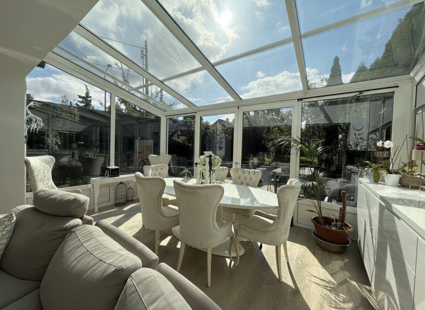 Lichtdurchfluteter Wintergarten mit elektrischer Markise