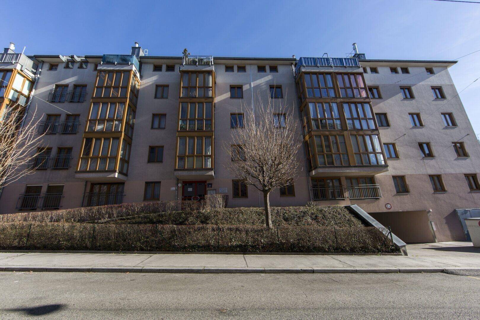 Das Haus und die Zufahrt befinden sich in einer ruhigen Seitengasse zwischen Linzer Straße und Hütteldorfer Straße.