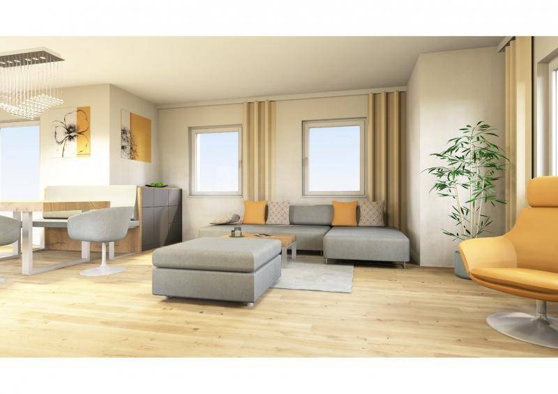 Das Obergeschoß erstreckt sich mit dem Schlafzimmer mit Schrankraum, einer Büro Ecke, einem großzügigen Badezimmer, der Toilette, der Speisekammer bis hin zum offenen Wohn-Essbereich der mit 44 m² optimal belichtet wurde. Weitere Besonderheiten sind die drei Balkone sowie die Außentreppe in den Garten.