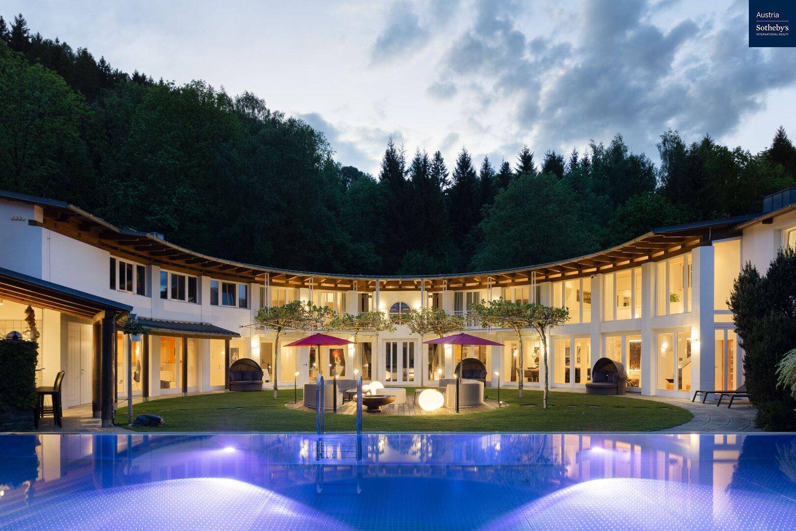 Ende der 90er Jahre vom Stararchitekten Ronacher entworfen, vor kurzem generalsaniert und modernisiert, steht der halbkreisförmige Prachtbau ins Licht der Sonne ausgerichtet, inmitten rauschender Wälder, mit Grün- und Weitblick. Ohne zeitliche Einschränkung, kann man hier das Leben in all seinen Facetten ausreizen und genießen ! Der Winter hier ist wunderbar still, Rehe kommen ganz nahe ans Haus und ob in der urigen Bauernstube, am Panoramakamin, in der Bibliothek, oder in der Sauna - nichts ist laut, niemand stört und keine Insel im Meer könnte mit dieser famosen Mischung aus Abgeschiedenheit und Zentralität gleichermaßen mithalten !