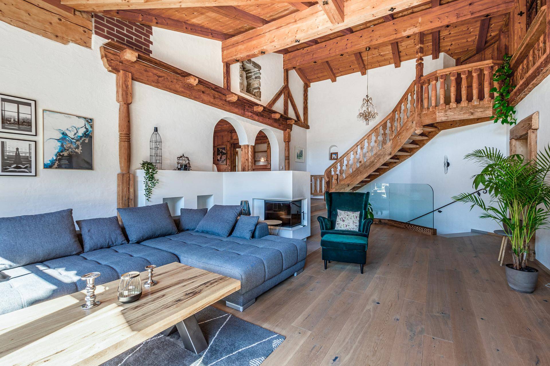 Das Herzstück des Chalets ist die großzügige und hochwertig ausgestattete Dachgeschossmaisonette. Der Wohnbereich mit gemütlicher Stube, offenem Kamin und Kachelofen sorgt für ein behagliches Ambiente. Die Küche bietet direkten Zugang auf die sonnige Westterrasse – perfekt für gesellige Stunden im Freien. Drei Schlafzimmer, darunter ein Masterzimmer mit Wintergarten, Kamin und Schrankraum, runden das Raumangebot auf dieser Ebene ab. Ein Badezimmer mit Dusche ergänzt die Ausstattung. Über eine rustikale Treppe gelangt man ins Dachgeschoss, wo sich ein weiteres Schlafzimmer befindet. Die Kombination aus imposanter Raumhöhe, Sichtdachstuhl sowie sonnigen Terrassen- und Balkonflächen macht diese Einheit zu einem ganz besonderen Wohnerlebnis.
