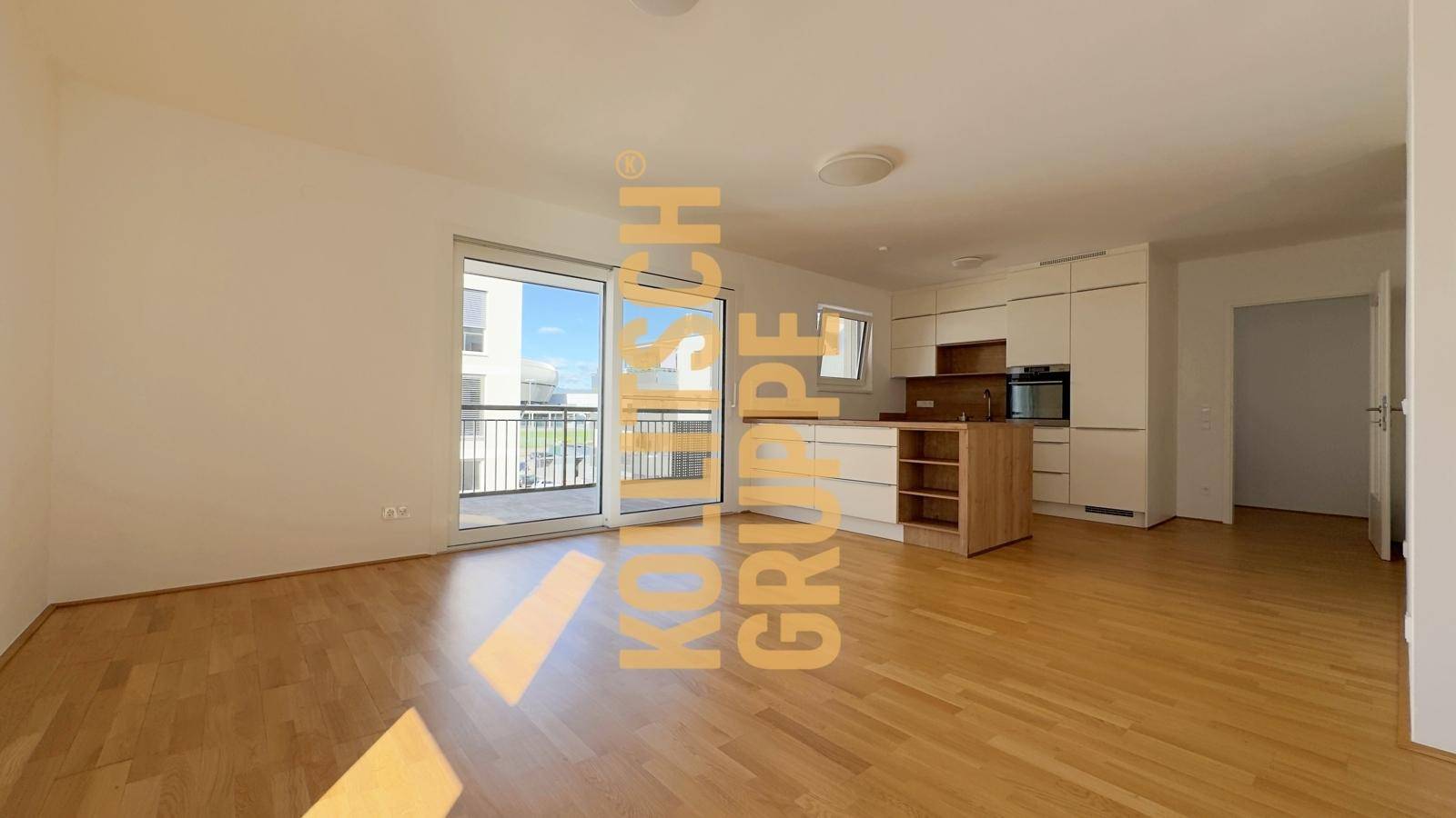 Der offen gestaltete Wohn-, Ess- und Kochbereich mit rund 34,6 m² ist das Herzstück der Wohnung. Die große, moderne Küche mit Kochinsel fügt sich harmonisch in den Raum ein und lädt zum gemeinsamen Kochen und Genießen ein. Eine großzügige Hebe-Schiebetüre führt vom Wohnzimmer auf den westseitig ausgerichteten Balkon – ideal, um die Abendsonne zu genießen und den Wohnraum nach draußen zu erweitern.