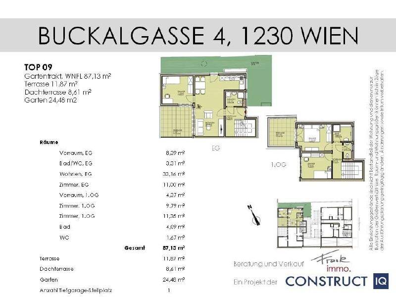Die Wohnung besteht aus Vorraum, 3 Zimmer, Wohn/Eßbereich mit eingerichteter Küche, 2 Bäder (Dusche, Badewanne), 2 WCs, Waschmaschinenanschluß, 2 Terrassen (8,61 m2 und 11,87 m2) kleiner Eigengarten